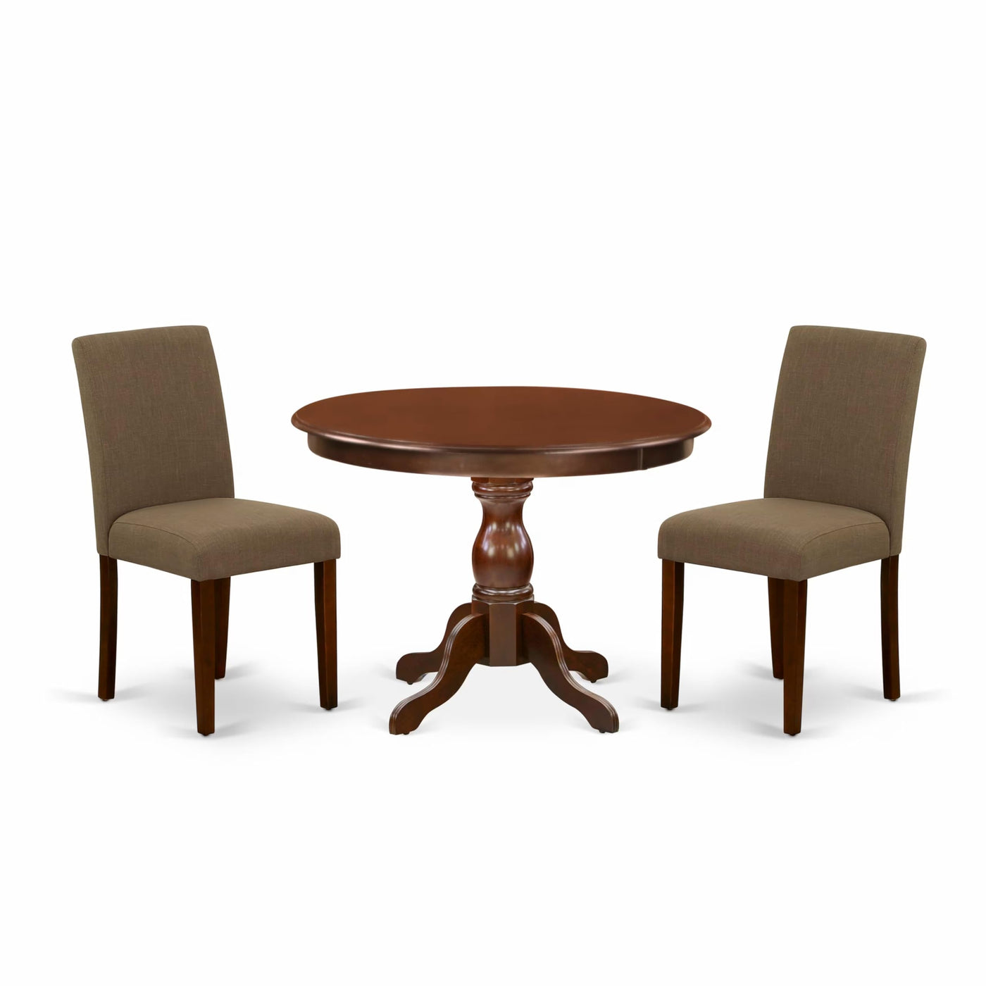 EAST WEST FURNITURE - HBAB3-MAH-18 - 3-PIECE DINING SETIntroducing our 3-Piece table set, designed to meet your family's dining needs with a round, contemporary dining table and 2 chairs. This dining set boasts an elegant and captivating appearance. The mahogany kitchen and dining room chairs, featuring a classy design, perfectly complement any dining area. Enhance your interior decor with our traditional-style kitchen table set, which adds a touch of sophistication. The mahogany textured finish brings a unique charm to various dining rooms, while the wooden legs of both the chairs and the dining table contribute to their durability and timeless appeal. Experience the added elegance brought by our modern-style dining room set, which you and your family will truly enjoy. The mid-century modern chairs offer exceptional comfort with their high back and cone-shaped legs. For reliable support, the dining room chairs are equipped with Zig Zag springs, made from two-dimensional S-shaped wires, also known as No-Sag springs. These high carbon steel springs ensure the seats remain sturdy under any suspension and weight. With its smooth surface, our dining table set is easy to clean with a simple wipe-down, making maintenance hassle-free. Assembly is quick and easy, as long as you follow the step-by-step instructions provided.PRODUCT FEATURES: Fabric Type: Linen Fabric Linen Fabric Color: Coffee Dining Room Table Top Color: Mahogany Dining Room Table Finish: Mahogany Kitchen Chairs Legs Color: Mahogany Chairs for Dining Room Back Style: High Back Modern Chair Dimension: Length: 22; Width: 17.20; Height: 35.20. Dimension of Modern Dining Table: Length: 42; Width: 42; Height: 29.5.Included: 1 Pedestal Small Kitchen Table and 2 Dining Chairs.