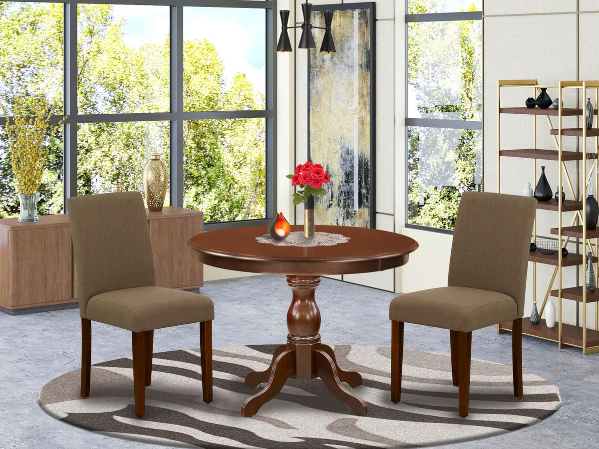East West Furniture HBAB3-MAH-18 3 Piece Dining Room Table Set Contains a Round Kitchen Table with Pedestal and 2 Coffee Linen Fabric Parson Dining Chairs, 42x42 Inch, Mahogany