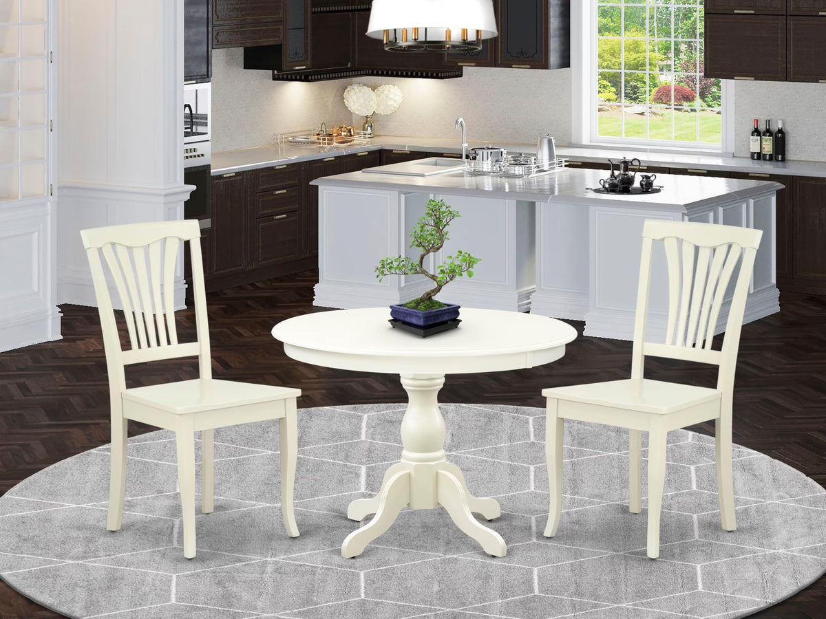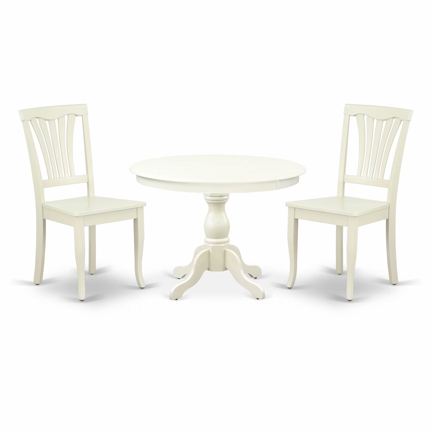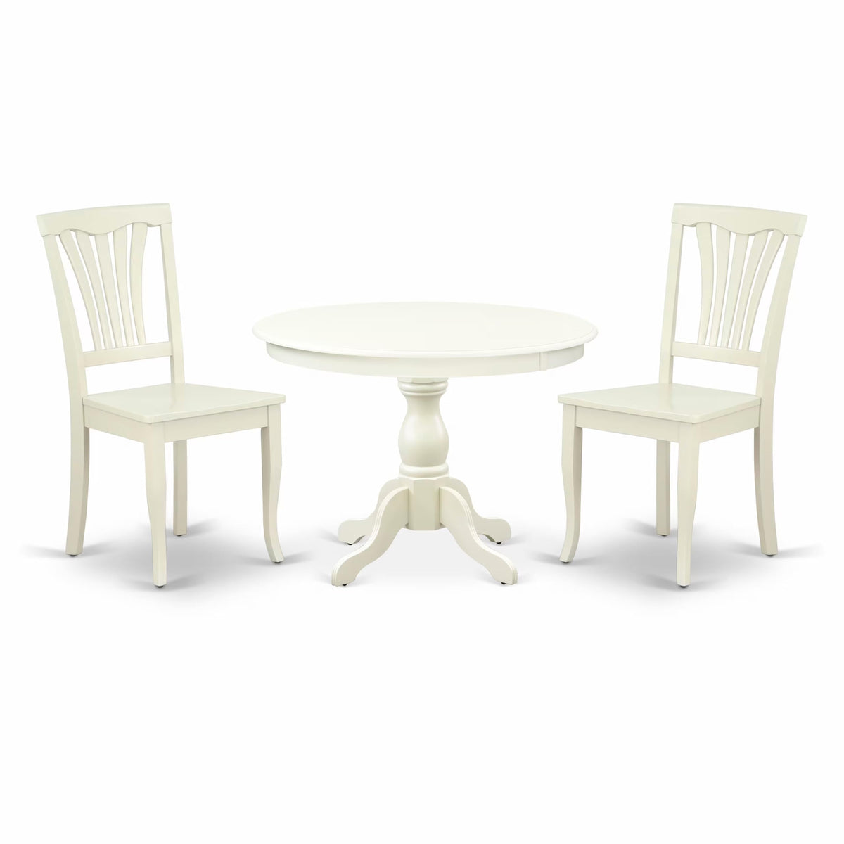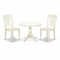EAST WEST FURNITURE - HBAV3-LWH-W - 3-Pc MODERN DINING TABLE SETIntroducing our 3-Piece kitchen table set, consisting of a round dining table and 2 dining room chairs, designed to comfortably accommodate your family. This set showcases a sophisticated and captivating appearance, making it a perfect match for any dining area. Enhance your interior decor with our rustic design kitchen set, featuring elegant linen white chairs and a table that add a unique allure to your dining space. The wooden legs of both the chairs and the kitchen table enhance the overall sturdiness and traditional ambiance. The modern-style kitchen table set adds an elegant touch to your home, ensuring a delightful dining experience for you and your family. Our kitchen chairs provide exceptional comfort with their slatted back and cone-shaped legs. Cleaning the dining table set is effortless, thanks to its smooth surface that can be easily wiped down for hassle-free maintenance. Assembling the dining set is quick and easy, with step-by-step instructions provided for your convenience.PRODUCT FEATURES: Wood Type: Asian Wood Chairs Back Style: Slatted Back Color: Linen White Chairs Dimension: Length: 22; Width: 18; Height: 36. Dimension of Table: Length: 42; Width: 42; Height: 29.5.Include in this Package: 1 Dining Table and 2 Wood Chairs.