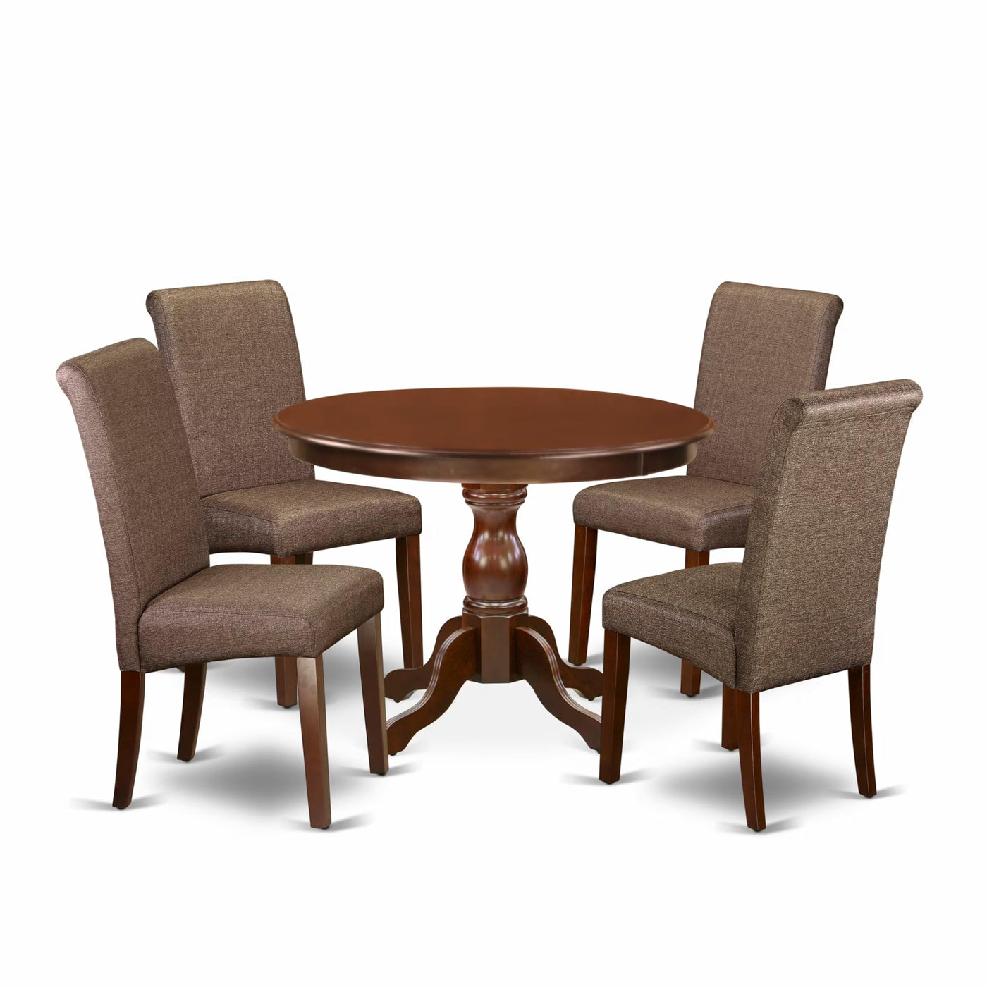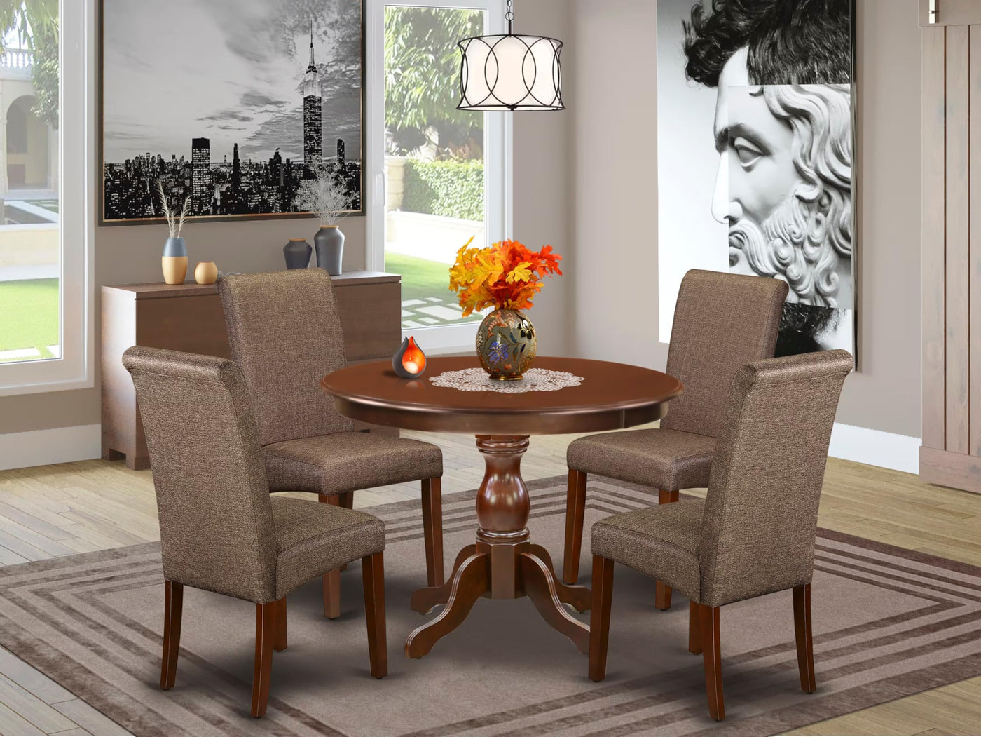 East West Furniture HBBA5-MAH-18 5 Piece Modern Dining Table Set Includes a Round Wooden Table with Pedestal and 4 Brown Linen Linen Fabric Parson Dining Chairs, 42x42 Inch, Mahogany