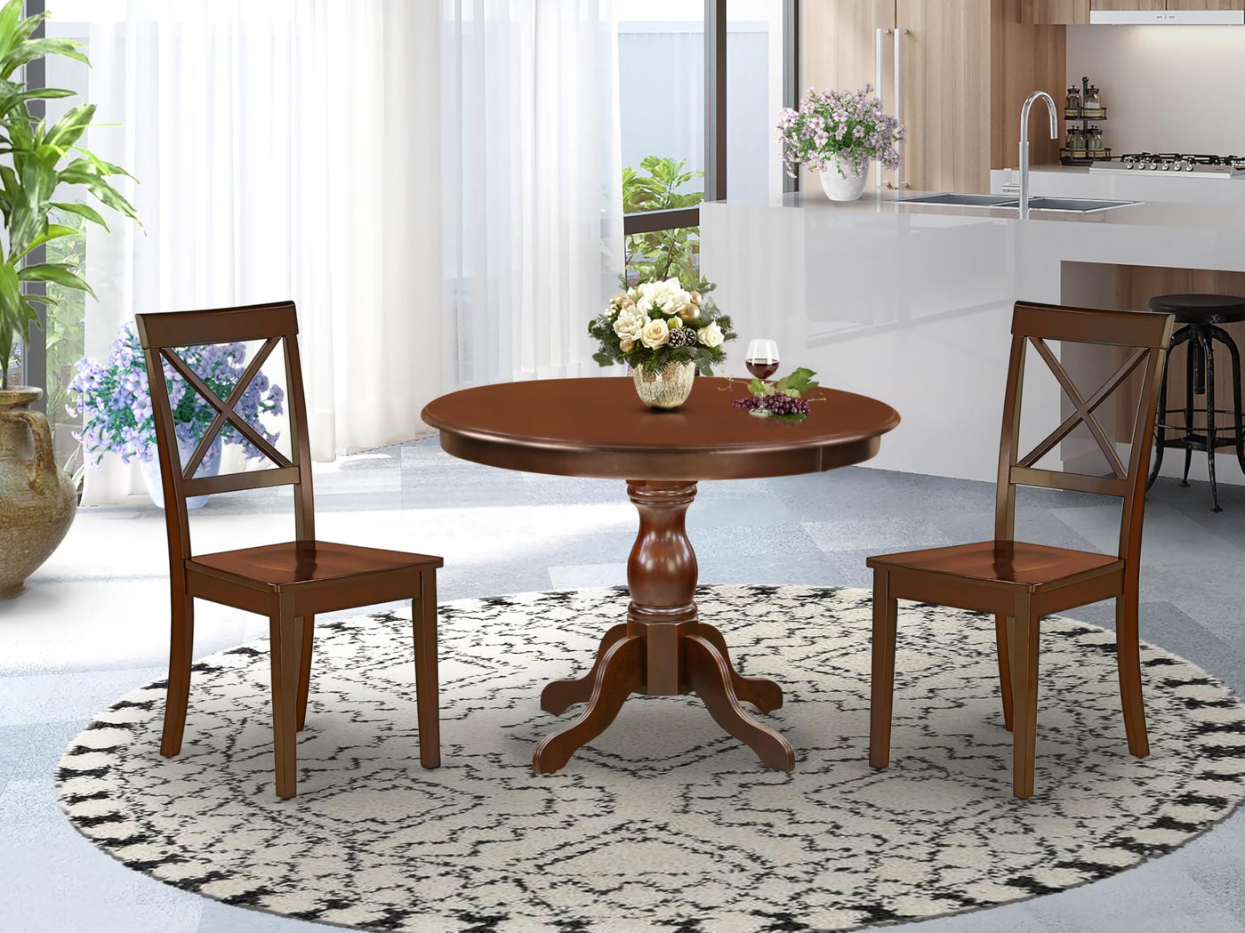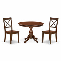 EAST WEST FURNITURE - HBBO3-MAH-W - 3-Pc TABLE SETIntroducing our 3-Piece dining table set, which includes a round kitchen table and 2 dining room chairs perfectly suited for your family's needs. This kitchen set boasts an elegant and captivating appearance, making it an ideal match for any dining room. Enhance your home decor with our rustic-style dining set, featuring charming Mahogany kitchen chairs. The textured finish of the Mahogany chairs adds a unique allure to your dining room, while the wooden legs of both the chairs and dining table contribute to a solid and traditional feel. The modern design of the table and chairs infuses a touch of sophistication into your home, providing you and your family with a delightful dining experience. The X-back and cone-shaped legs of the kitchen chairs ensure a fantastic and relaxing seating experience. Additionally, the smooth surface of the dining table makes it easy to clean with a simple wipe down, allowing for hassle-free maintenance. Assembling our kitchen table set is a breeze, thanks to the step-by-step guidelines provided, ensuring a quick and effortless setup.PRODUCT FEATURES: Wood Type: Asian Wood Chairs for Back Style: X-Back Color: Mahogany Chairs Dimension: Length: 21; Width: 18; Height: 38. Dimension of Table: Length: 42; Width: 42; Height: 29.5.Include in this Package: 1 Modern Dining Table and 2 Kitchen Chairs.