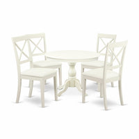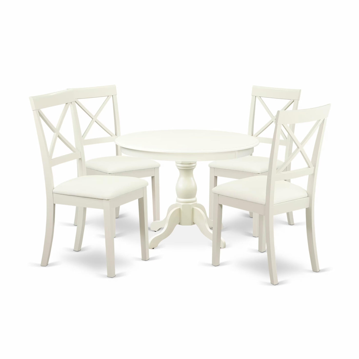 EAST WEST FURNITURE - HBBO5-LWH-C - 5-PC kitchen SETExperience the charm and functionality of our 5-Piece kitchen set, comprising a breakfast table and 4 dining room chairs, perfectly accommodating your entire family. With its sophisticated and visually appealing design, this dining set will effortlessly complement any dining area. Elevate your interior decor with our antique-style table and chairs kitchen table set, featuring traditional Linen White modern chairs. The textured finish in Linen White adds a unique allure to your dining area, while the wooden legs of both the chairs and table enhance their sturdiness and traditional aesthetic. Adding a touch of elegance to your home, the contemporary-style kitchen set ensures a delightful dining experience for you and your family. Our kitchen chairs with X-back and cone-shaped legs provide incredible comfort and relaxation. The smooth surface of the dining table set facilitates easy cleaning, requiring just a wipe down for hassle-free maintenance. Assembling our dining room table set is quick and easy, thanks to the step-by-step instructions provided.PRODUCT FEATURES: Fabric Type: Faux Leather Color: Linen White Chairs Back Style: X-back Chairs for Dimension: Length: 21; Width: 18; Height: 38. Dimension of Table: Length: 42; Width: 42; Height: 29.5.Include in this Package: 1 Wood Table and 4 modern chairs.