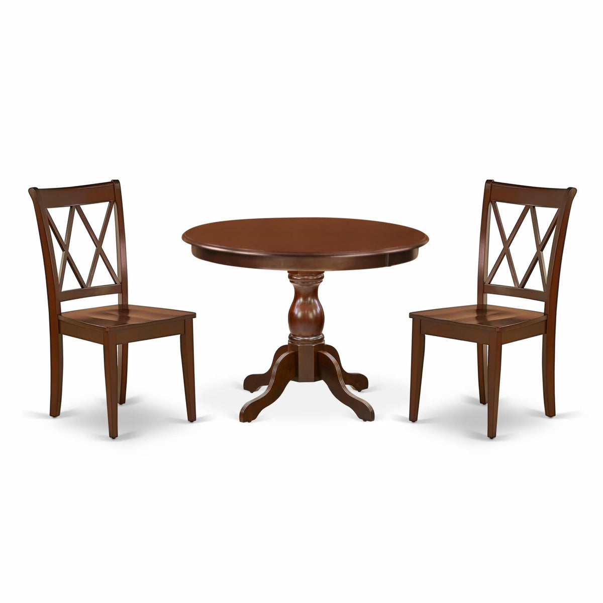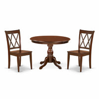 EAST WEST FURNITURE - HBCL3-MAH-W - 3-Pc DINING SETIntroducing our 3-Piece kitchen table set, consisting of a round table and 2 modern chairs suitable for both kitchen and dining room use. This dining table set boasts an elegant and captivating appearance. Its sophisticated design and rustic Mahogany wood chairs make it a perfect match for any dining room decor. Enhance your home's aesthetic with our charming rustic kitchen set. The textured Mahogany finish adds a unique allure to any dining space, while the wooden legs of the chairs and small table contribute to a solid and traditional feel. The modern style of this table and chairs dining set brings a touch of elegance to your home, providing an enjoyable atmosphere for you and your family. Our wooden dining chairs offer an incredibly relaxing experience with their double X-back and cone-shaped legs. With its smooth surface, this dining table set is easy to clean and requires hassle-free maintenance with a simple wipe down. Assembly of the kitchen set is quick and easy, as long as you follow the step-by-step instructions.PRODUCT FEATURES: Wood Type: Asian Wood Kitchen Chair Legs Color: Mahogany Wooden Dining Chairs Back Style: Double X-Back Small Kitchen Table Top Color: Mahogany Round Dining Table Legs Color: Mahogany Dining Chairs Dimension: Length: 22; Width: 18; Height: 37. Dimension of Round Dining Table: Length: 42; Width: 42; Height: 29.5.Included: 1 Dining Table and 2 Dining Chairs.