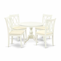 EAST WEST FURNITURE - HBCL5-LWH-C - 5-Pc KITCHEN TABLE SETIntroducing our 5-Piece kitchen table set with a dinner table and 4 dining room chairs, perfect for accommodating your family. The set features a sophisticated and eye-catching design, complemented by rustic linen white wooden chairs that effortlessly match any dining area. Enhance your home decor with our antique-inspired dining set, complete with a linen white textured finish that adds a unique allure. The wooden legs of both the chairs and table enhance solidity and provide a traditional feel. The contemporary style of the set adds an elegant touch to your home, ensuring a delightful dining experience for you and your family. The dining chairs offer incredible relaxation with their double X-back design and cone-shaped legs. Our mid-century kitchen chair features No-Sag springs, made from high carbon steel wires, ensuring durability and weight support. The smooth surface of the dining table set makes cleaning a breeze, requiring only a simple wipe down for hassle-free maintenance. Assembly is quick and easy, with step-by-step guidelines provided for your convenience.PRODUCT FEATURES: Wood Type: Asian Wood Dining Chairs Legs Color: Linen White Wooden Dining Chairs Back Style: Double X-Back Kitchen Table and Chairs Top Color: Linen White Wood Table Legs Color: Linen White Wood Chairs Dimension: Length: 22; Width: 18; Height: 37. Dimension of Dining Room Table: Length: 42; Width: 42; Height: 29.5.Included: 1 Modern Dining Table and 4 Kitchen Chairs.