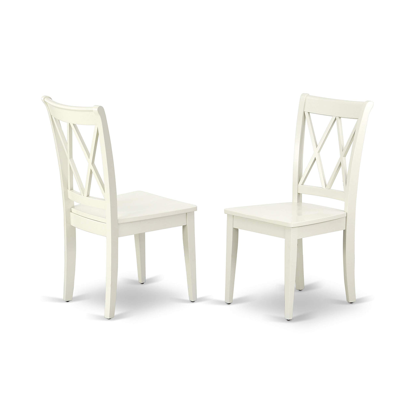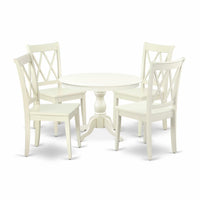 EAST WEST FURNITURE - HBCL5-LWH-W - 5-Pc DINING TABLE SETIntroducing our 5-Piece kitchen set, which includes a dining table and 4 matching kitchen chairs, providing ample seating for your entire family. This dining table set showcases a sophisticated and captivating aesthetic, featuring an elegant design and rustic, linen white kitchen chairs that effortlessly complement any dining space. Enhance your interior decor with our antique-style dining set, as the linen white textured finish adds a unique charm to any dining room. Moreover, the solid wooden legs of both the chairs and the small kitchen table contribute to a sense of stability and traditional ambiance. The contemporary style of this dining room set adds a touch of elegance to your home, offering an enjoyable dining experience for you and your family. The dining chairs are designed with a double X-back and cone-shaped legs, providing incredible comfort and relaxation. Thanks to its smooth surface, our dining table set is easy to clean with a simple wipe down, ensuring hassle-free maintenance. Additionally, the assembly of our dining table set is quick and straightforward, as it includes step-by-step guidelines for easy assembly.PRODUCT FEATURES: Wood Type: Asian Wood Kitchen Chair Legs Color: Linen White Dining Chairs Back Style: Double X-Back Modern Dining Table Top Color: Linen White Wood Dining Table Legs Color: Linen White Kitchen Chairs Dimension: Length: 22; Width: 18; Height: 37. Dimension of Dinning Table: Length: 42; Width: 42; Height: 29.5.Included: 1 Dining Table and 4 Dining Chairs.