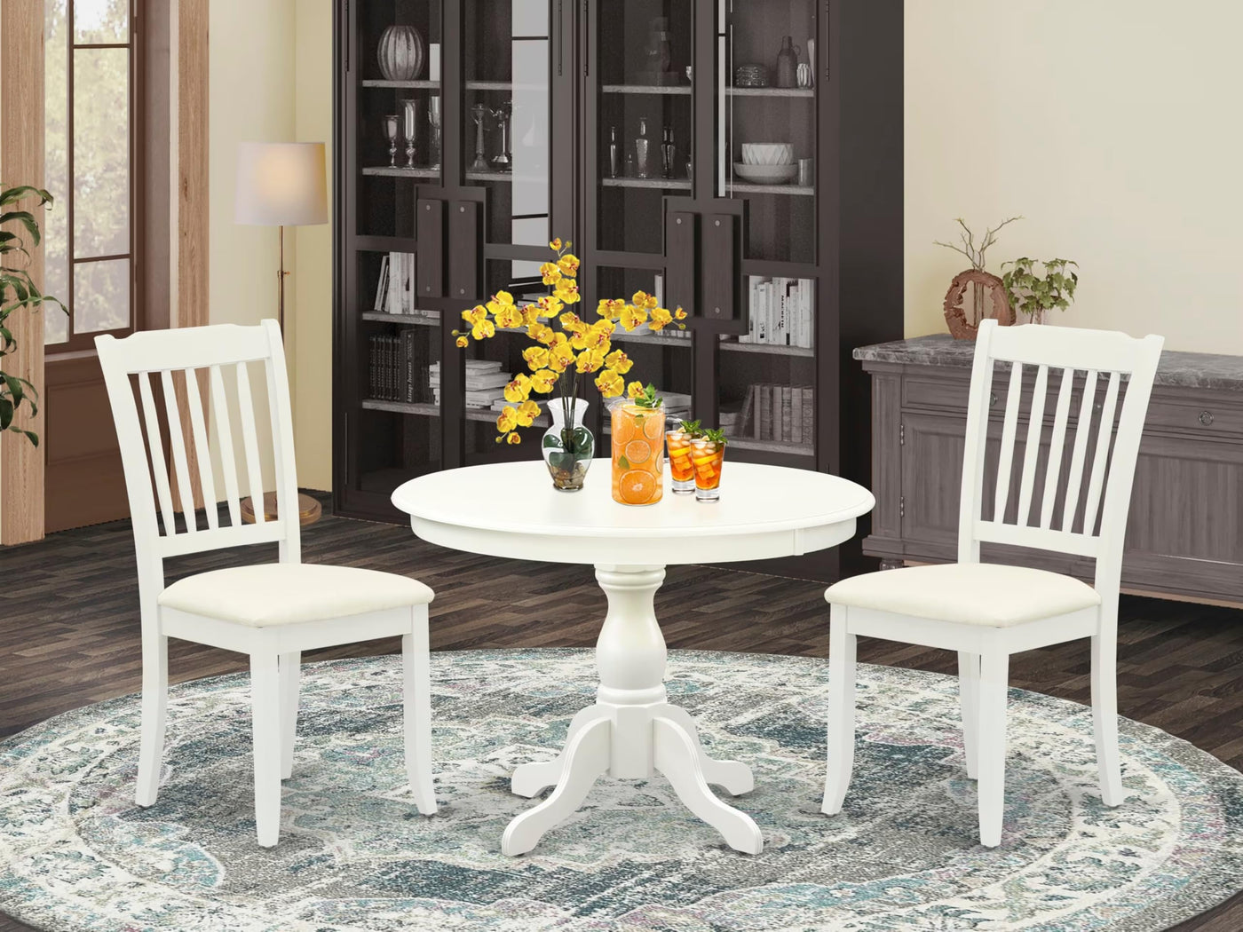 EAST WEST FURNITURE - HBDA3-LWH-C - 3-Pc DINING ROOM SETIntroducing our contemporary 3 piece dining room set, consisting of a kitchen table and 2 modern chairs, designed to comfortably accommodate your entire family. With its sophisticated and captivating appearance, this dining table set complements any decor style. The rustic yet elegant linen white dining chairs perfectly match any dining area, while the traditional design of our kitchen set allows you to transform your interior decor. The linen white textured finish adds a unique charm to the dining area, and the wooden legs of both the chairs and table enhance their durability and traditional appeal. Experience a touch of elegance in your home with this modern-style kitchen set, which you and your family will truly enjoy. Our dining chairs provide an incredibly relaxing seating experience, featuring slatted backs and cone-shaped legs. Equipped with Zig Zag springs, also known as No-Sag springs, made from high carbon steel wires, these chairs offer exceptional sturdiness and support. The smooth surface of the dining table set ensures easy cleaning and hassle-free maintenance with a simple wipe down. Assembling our kitchen dining table set is quick and easy, as long as you follow the step-by-step instructions provided.PRODUCT FEATURES: Wood Type: Asian Wood Chairs Back Style: Slatted Back Color: Linen White Chairs Dimension: Length: 22; Width: 18; Height: 38. Dimension of Table: Length: 42; Width: 42; Height: 29.5.Include in this Package: 1 Dining Table and 2 Dining Chairs.