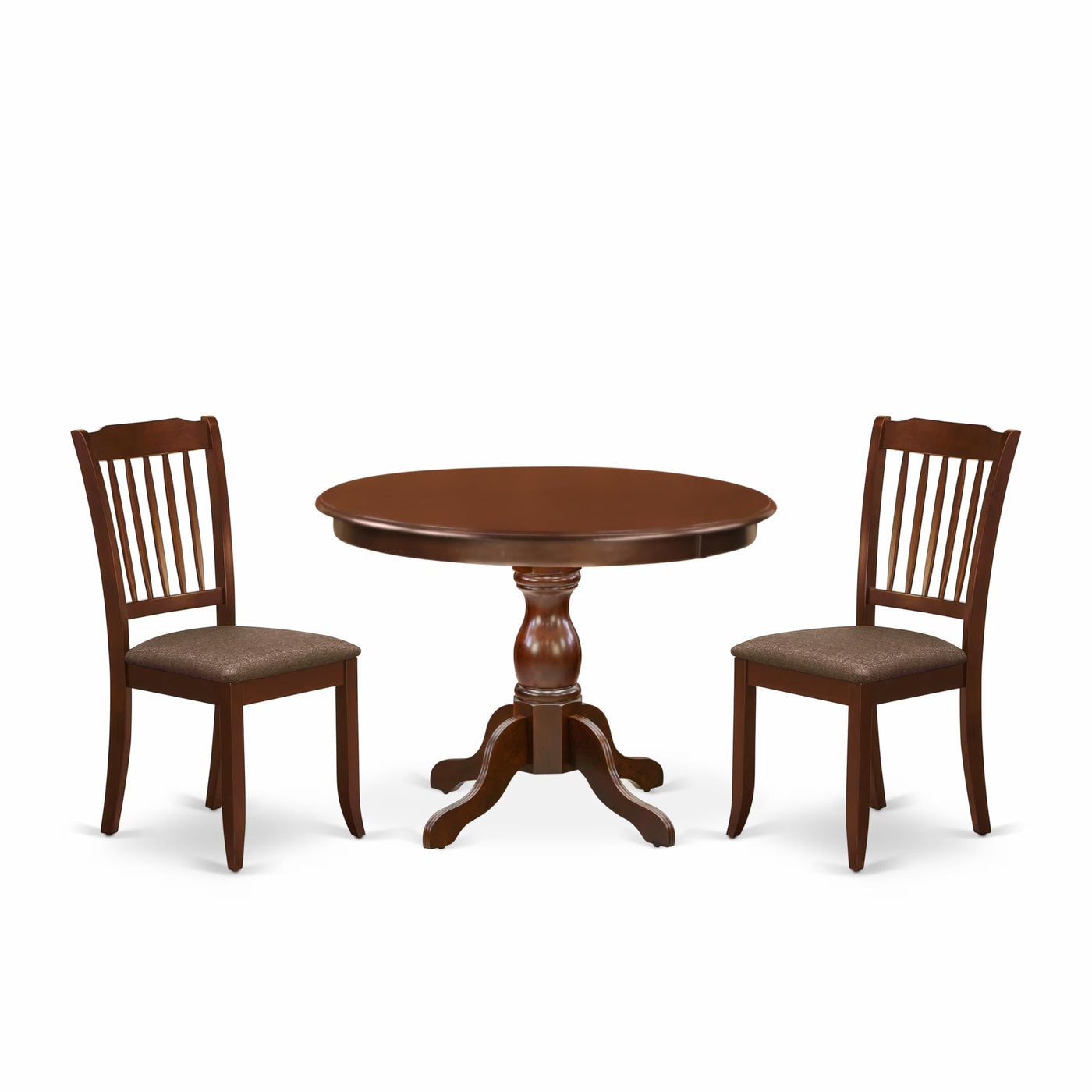 EAST WEST FURNITURE - HBDA3-MAH-C - 3-Pc KITCHEN SETIntroducing our 3-Piece kitchen table set, consisting of a modern dining table and 2 dining room chairs, ideal for your family. This dining room set showcases a sophisticated and captivating appearance, with elegant Rustic Mahogany kitchen chairs that can complement any dining room. Transform your home decor with our rustic-style dining set, featuring a distinctive Mahogany textured finish. The wooden legs of both the dining chairs and table enhance stability and create a traditional feel. The modern-style kitchen set adds an elegant touch to any home, offering a delightful dining experience. The kitchen chairs feature a slatted back and cone-shaped legs for incredible relaxation. Equipped with Zig Zag springs, commonly known as No-Sag springs, the dining room chairs provide sturdy support and weight-bearing capacity. The smooth surface of our dining table set ensures effortless cleaning and hassle-free maintenance. Assembly is quick and easy, with step-by-step instructions provided for your convenience.PRODUCT FEATURES: Wood Type: Asian Wood Dining Chairs Legs Color: Mahogany Dining Chairs Back Style: Slatted Back Dining Table Top Color: Mahogany Wood Dining Table Legs Color: Mahogany Dining Room Chairs Dimension: Length: 22; Width: 18; Height: 38. Dimension of Breakfast Table: Length: 42; Width: 42; Height: 29.5.Include in this Dining Set- 1 Kitchen Table and 2 Dining Chairs.