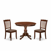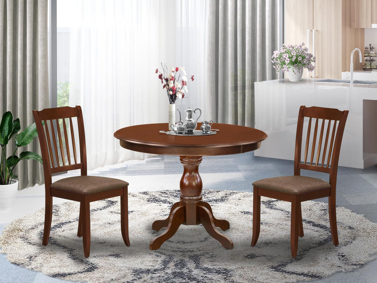 East West Furniture HBDA3-MAH-C 3 Piece Dining Set Contains a Round Dining Room Table with Pedestal and 2 Linen Fabric Upholstered Chairs, 42x42 Inch, Mahogany