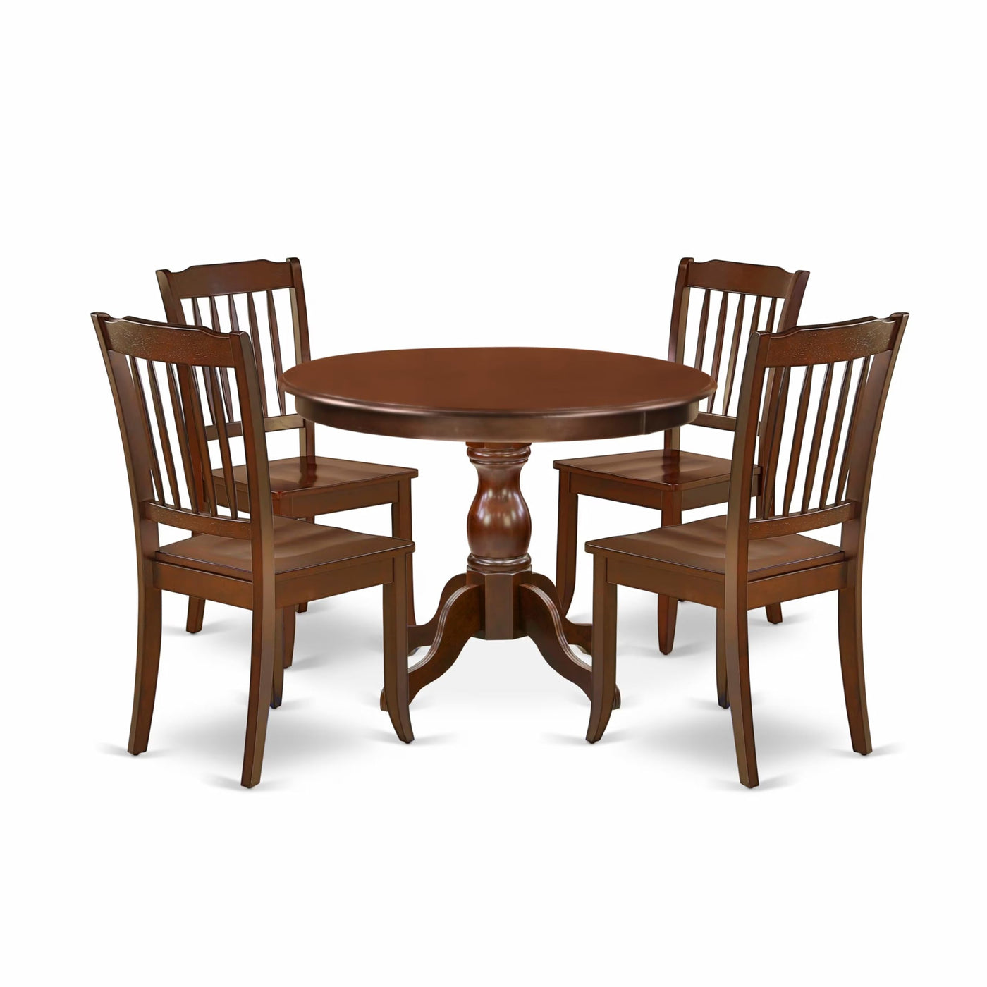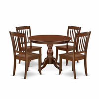 EAST WEST FURNITURE - HBDA5-MAH-W - 5-Pc DINING TABLE SETIntroducing our 5-Piece dining table set, comprising a sleek round kitchen table and 4 dining room chairs, providing ample seating for your entire family. The kitchen table set boasts an elegant and captivating design, perfectly suited for any dining room. Elevate your interior decor with our rustic-style dining room set, featuring mahogany dining chairs that exude a timeless charm. The textured mahogany finish adds a distinctive allure to your dining space, while the wooden legs of both the chairs and table enhance their sturdiness and traditional appeal. Infuse a touch of sophistication into your home with this modern-style kitchen dining table set, ensuring a delightful experience for you and your family. The slatted back and cone-shaped legs of our dining room chairs offer a fantastic relaxing experience. With its smooth surface, this dining table set for four is easy to clean by simply wiping it down, allowing for hassle-free maintenance.PRODUCT FEATURES: Wood Type: Asian Wood Chairs Back Style: Slatted Back Color: Mahogany Chairs Dimension: Length: 22; Width: 18; Height: 38. Dimension of Table: Length: 42; Width: 42; Height: 29.5.Include in this Dining Set- 1 Dinning Table and 4 Kitchen and Dining Room Chairs.
