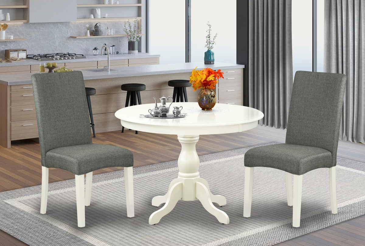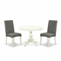 East West Furniture HBDR3-LWH-07 3 Piece Dining Set Contains a Round Dining Room Table with Pedestal and 2 Gray Linen Fabric Upholstered Parson Chairs, 42x42 Inch, Linen White