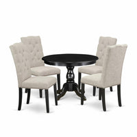 EAST WEST FURNITURE - HBEL5-ABK-35 - 5-Pc DINING TABLE SETIntroducing our elegant 5-Piece dining set, consisting of a kitchen table and 4 dining chairs, designed to comfortably accommodate your entire family. With its captivating and sophisticated appearance, this set adds a touch of class to any space. The chairs, made of luxurious doeskin material, boast a refined design that complements any room decor effortlessly. Transform your home with our traditional-style dining set, featuring a Wire Brushed Black textured finish that brings allure to any dining area. Crafted with utmost care, this kitchen table set is meticulously made from premium-grade Asian wood, specifically Rubberwood, renowned for its exceptional quality. Moreover, we have taken great care in detail by incorporating anti-slipping protectors at the base of each leg, ensuring the safety of your floors and preventing any potential damage. The dining chairs provide a fantastic relaxing experience with their button-tufted backs and cone-shaped legs. Equipped with sturdy Zig Zag springs, they offer unparalleled support 0.0.and durability. Cleaning is a breeze with the smooth surface of our dining table set, requiring just a simple wipe down. Assembly is quick and hassle-free, thanks to the step-by-step guidelines provided.PRODUCT FEATURES: Fabric Type: Linen Fabric Linen Fabric Color: Doeskin Small Dining Table Top Color: Black Dinner Table Finish: Wire Brushed Black Mid Century Modern Chair Legs Color: Wire Brushed Black Dining Room Chairs Back Style: Button Tufted Back Dining Chairs Dimension: Length: 24.5; Width: 19; Height: 40.5. Dimension of Dinning Table: Length: 42; Width: 42; Height: 29.5.Included: 1 Round Dining Table and 4 mid-century modern chairs.