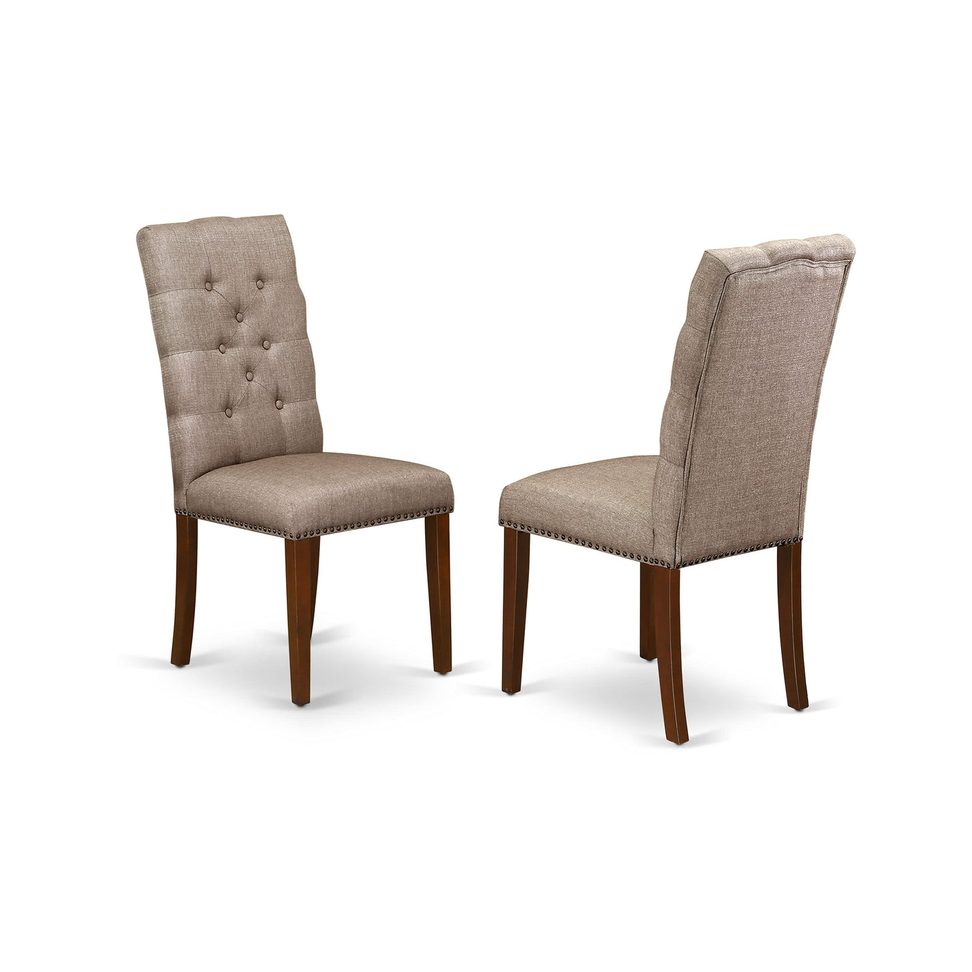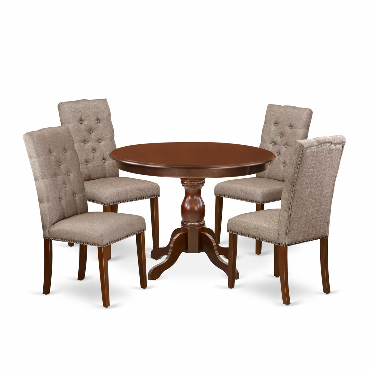 EAST WEST FURNITURE - HBEL5-MAH-16 - 5-PIECE KITCHEN DINING TABLE SETIntroducing our 5-piece dining table set, consisting of a kitchen table and 4 dining room chairs, providing ample seating for your family. This dining table set boasts an elegant and sophisticated design. The Dark Khaki upholstered dining chairs add a classy touch to any dining room, perfectly complementing the decor. With its antique-inspired design, our kitchen set can transform your home. The mahogany textured finish adds a unique charm to the dining area, while the wooden legs of the chairs and table enhance stability and a traditional feel The kitchen table set is meticulously crafted using Rubberwood, a premium wood sourced from Asia. Notably, we have thoughtfully integrated anti-slip protectors on the bottom of each leg, providing effective floor protection against potential scratches. The dining chairs seat feature button-tufted backs and cone-shaped legs, ensuring a fantastic relaxing experience. Our chairs are equipped with Zig Zag springs, also known as No-Sag springs, made of high carbon steel for added durability and weight support. The smooth surface of our dining table set makes it easy to clean with a simple wipe-down, requiring hassle-free maintenance.PRODUCT FEATURES: Fabric Type: Linen Fabric Linen Fabric Color: Dark Khaki Small Kitchen Table Top Color: Mahogany Dinning Table Finish: Mahogany Mid Century Modern Chair Legs Color: Mahogany Kitchen and Dining Room Chairs Back Style: Button Tufted Back Dining Chairs Dimension: Length: 24.5; Width: 19; Height: 40.5. Dimension of Wood Dining Table: Length: 42; Width: 42; Height: 29.5.Included: 1 Dinning Table and 4 Upholstered Dining Chairs.