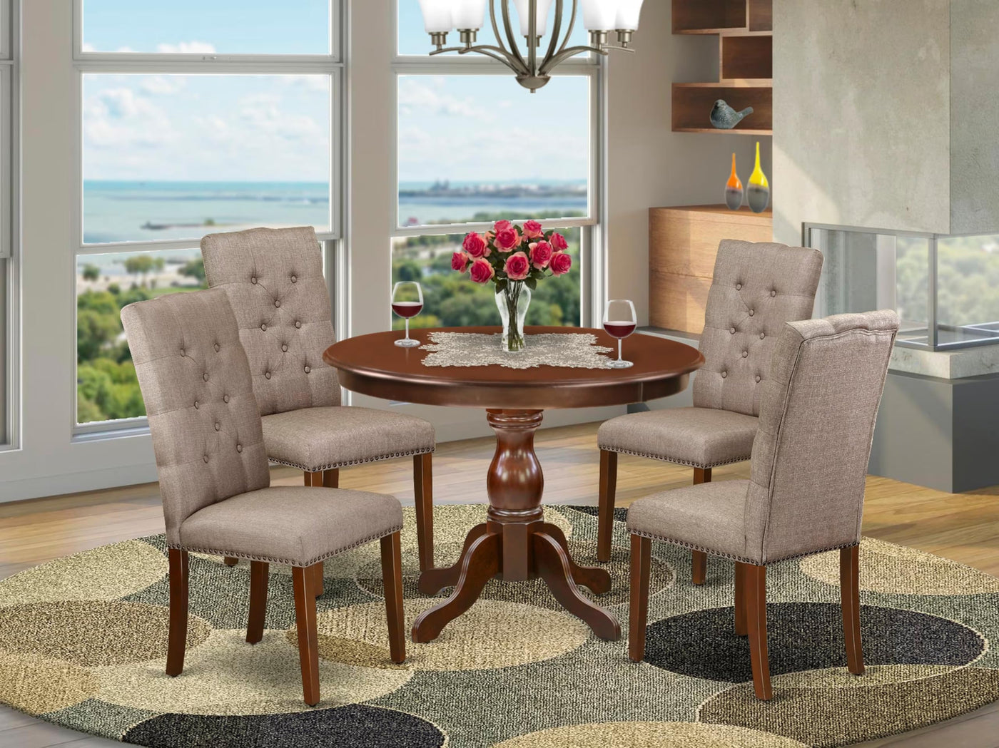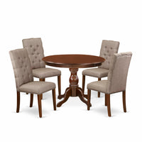 East West Furniture HBEL5-MAH-16 5 Piece Kitchen Table Set for 4 Includes a Round Dining Room Table with Pedestal and 4 Dark Khaki Linen Fabric Parsons Dining Chairs, 42x42 Inch, Mahogany