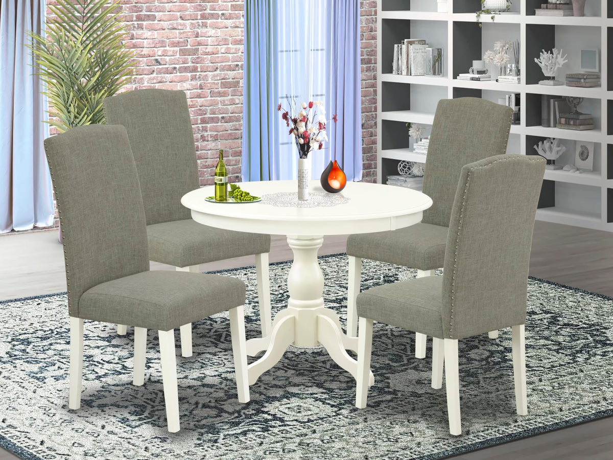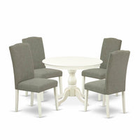 East West Furniture HBEN5-LWH-06 5 Piece Dining Table Set Includes a Round Dining Room Table with Pedestal and 4 Dark Shitake Linen Fabric Parsons Chairs, 42x42 Inch, Linen White