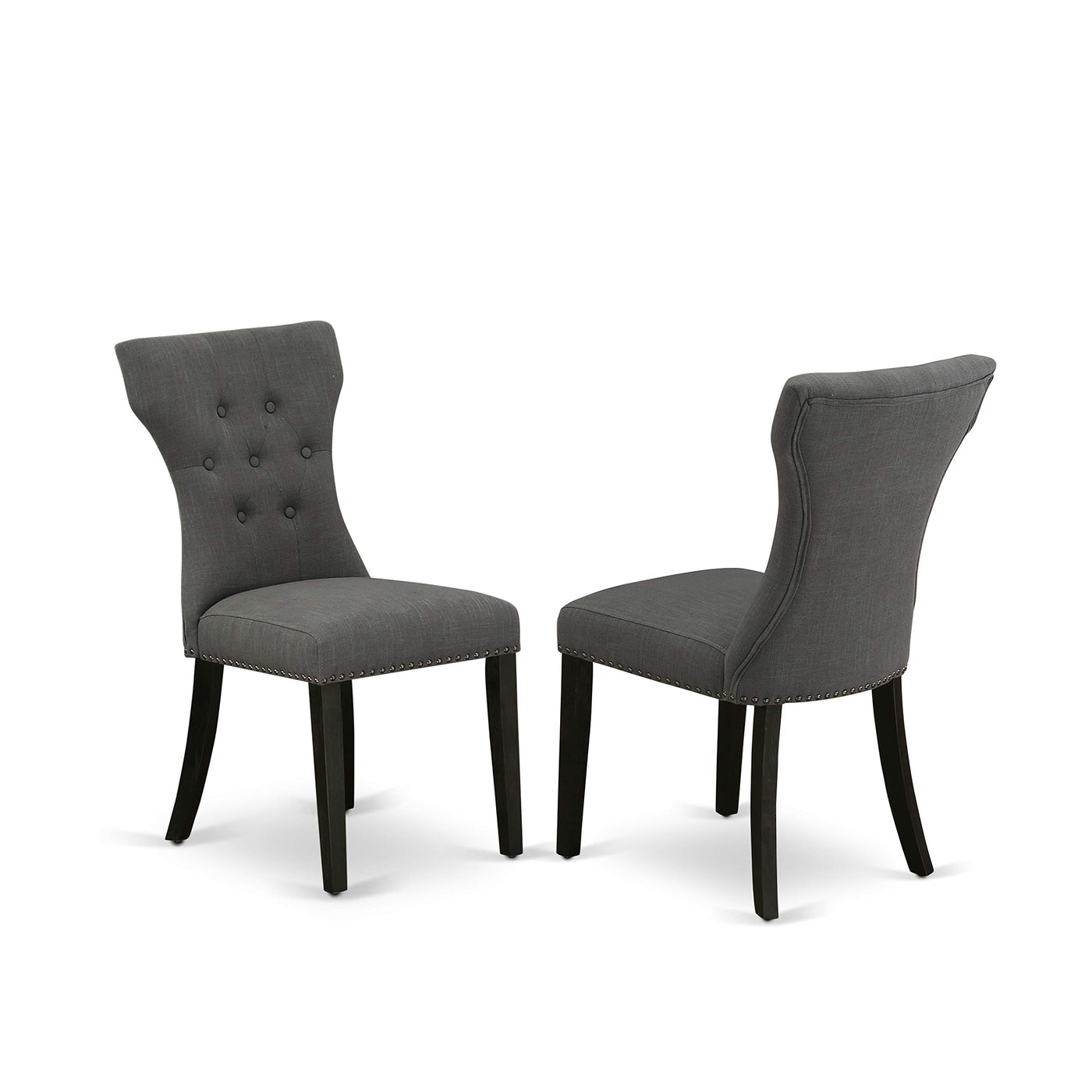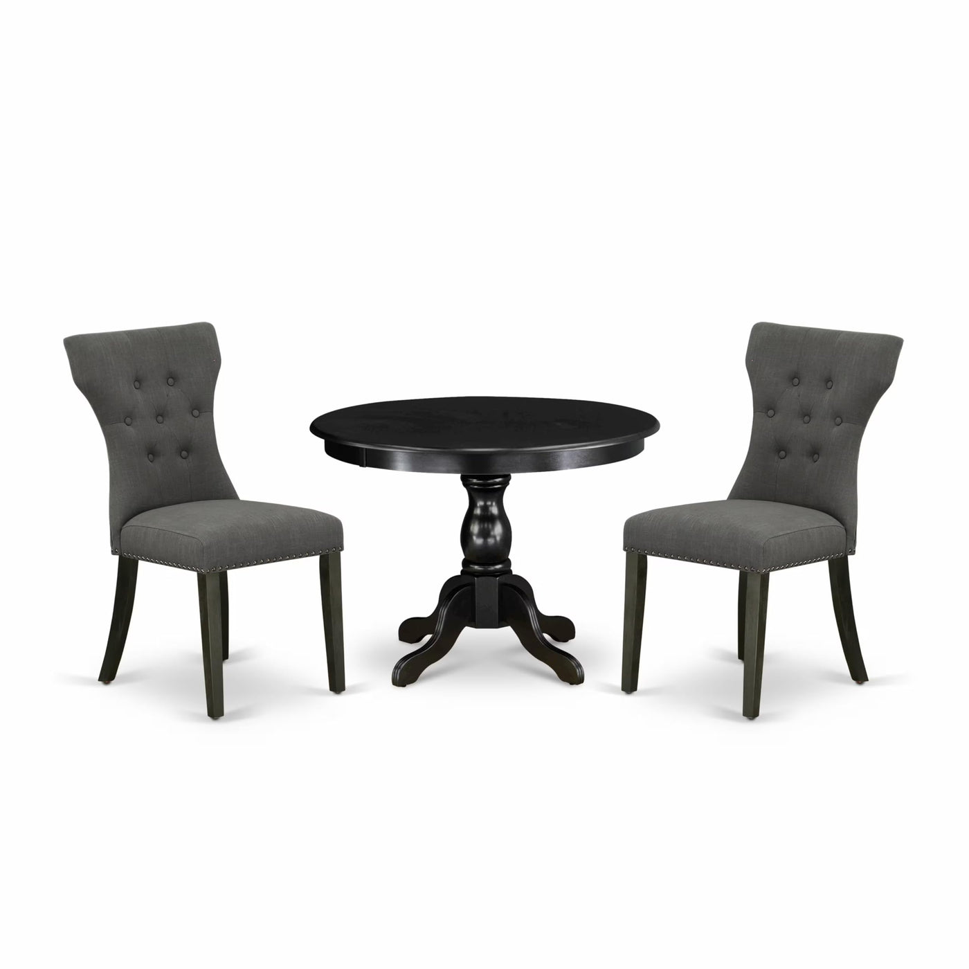 EAST WEST FURNITURE - HBGA3-ABK-50 - 3-Pc kitchen SETIntroducing our 3-Piece mid-century kitchen set, featuring a breakfast table and 2 modern dining chairs. Designed for your family's comfort, this dining table set showcases a captivating and innovative appearance. The Traditional, Dark Gotham Grey Parson Dining Chairs effortlessly complement any room. Enhance your interior decor with our rustic-style kitchen table set, boasting a Wire Brushed Black textured finish. Meticulously crafted with the finest attention to detail, this exquisite modern dining set exemplifies superior construction using Rubberwood, an esteemed Asian wood material. Designed with the utmost care, anti-slipping protectors have been thoughtfully incorporated beneath each leg to ensure the floor remains impeccably unblemished. The dining chairs offer incredible comfort with button tufted backs and cone-shaped legs. The chairs feature Zig Zag springs, known as No-Sag springs, for exceptional relaxation and durability. High carbon steel springs ensure sturdy seating and support for any weight. The dining table set has a smooth surface, making it effortless to clean. Assembly is quick and easy with step-by-step instructions provided.PRODUCT FEATURES: Fabric Type: Linen Fabric Linen Fabric Color: Dark Gotham Grey Kitchen Table Top Color: Black Small Dining Table Legs Finish: Wire Brushed Black Kitchen Chairs Legs Color: Wire Brushed Black Upholstered Dining Chairs Back Style: Button Tufted Back Dining Chairs Dimension: Length: 23; Width: 18; Height: 36. Dimension of Small Kitchen Table: Length: 42; Width: 42; Height: 29.5.Included: 1 Round Dining Table and 2 dining chairs.