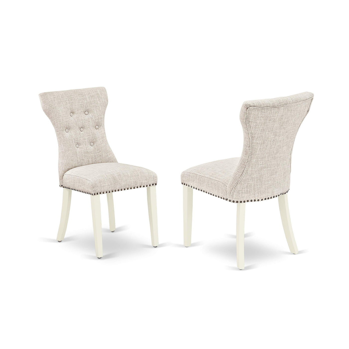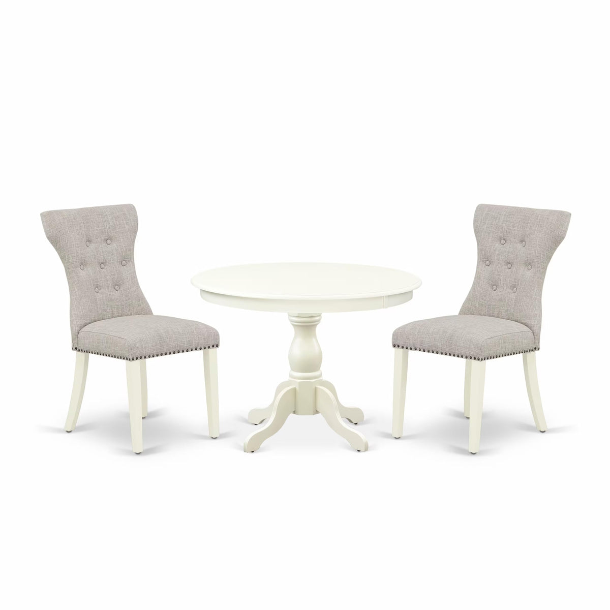 EAST WEST FURNITURE - HBGA3-LWH-35 - 3-PC DINING SETIntroducing our exquisite 3-Piece kitchen table set, complete with a breakfast table and 2 dining chairs, designed to accommodate your entire family. This set showcases a unique and captivating design, adding a touch of sophistication to any dining area. The Rustic, Doeskin upholstered dining chairs perfectly complement any decor style, making them an ideal choice for your dining room. Elevate your interior aesthetics with our charming rustic-designed dining table set. The Linen White textured finish adds a distinct allure to various dining spaces, while the wooden legs of both the modern chair and table enhance their stability and classic appeal. Crafted intricately from premium Rubberwood, a renowned Asian wood variety, our kitchen table set ensures long-lasting quality. Each leg is equipped with anti-slip protectors to safeguard your floor against scratches. The kitchen chairs feature comfortable Linen Fabric seats that enhance, enhancing the overall sitting experience. The meticulously designed button tufted backrest conforms to the spine's natural curvature, promoting optimal comfort and coziness. Furthermore, the thoughtfully crafted wide seats ensure exceptional levels of comfort. The smooth surface of our dining table set allows forOur dining table set's smooth surface allows easy cleaning and hassle-free maintenance with a simple wipe down. Assembling our kitchen dining table set is a breeze, as it includes step-by-step guidelines for quick and effortless assembly.PRODUCT FEATURES: Fabric Type: Linen Fabric Linen Fabric Color: Doeskin Modern Dining Table Top Color: Linen White Wood Table Legs Finish: Linen White Modern Chair Legs Color: Linen White Upholstered Dining Chairs Back Style: Button Tufted Back Kitchen Chairs Dimension: Length: 23; Width: 18; Height: 36. Dimension of Dinning Table: Length: 42; Width: 42; Height: 29.5.Included: 1 Small Dining Table and 2 Dining Chairs.