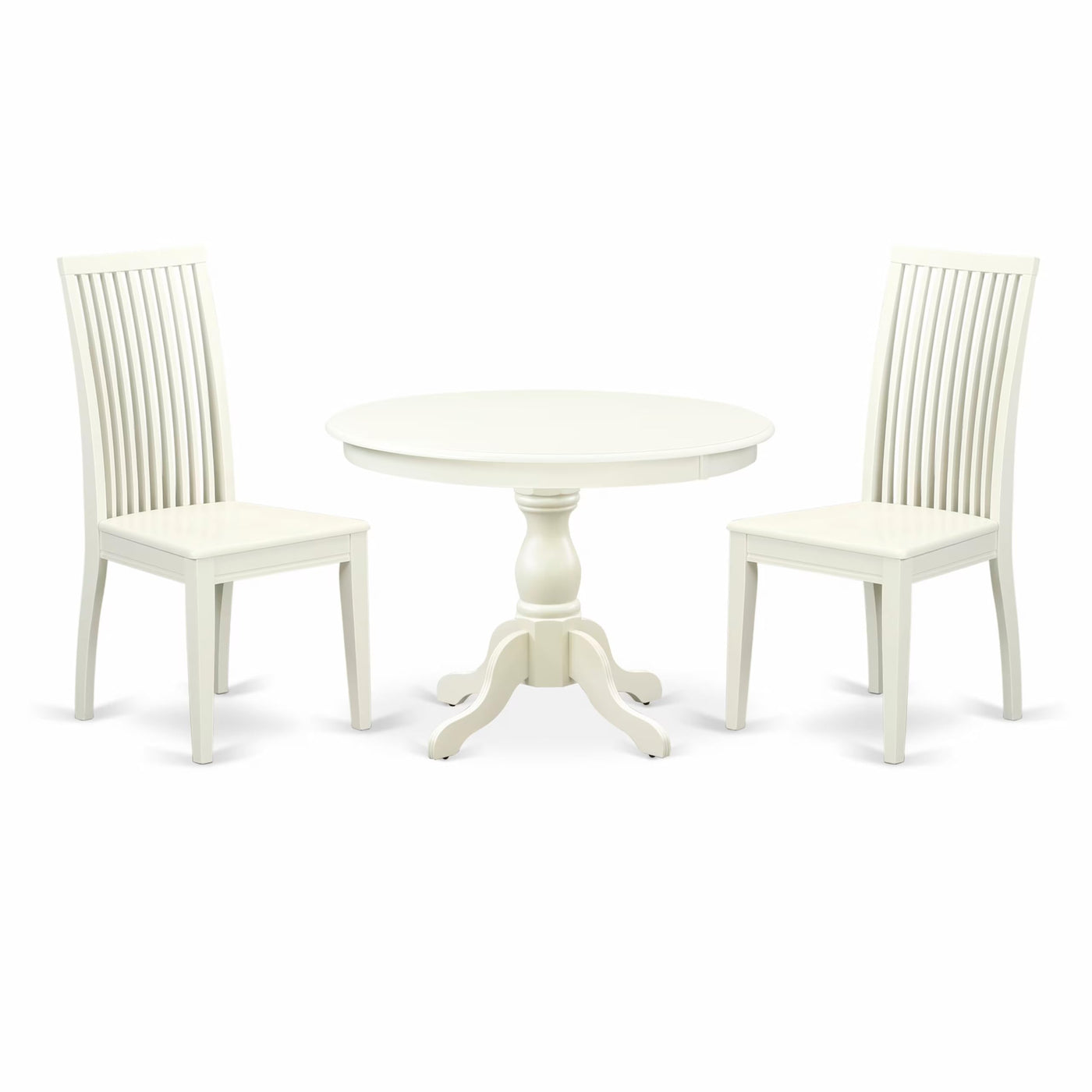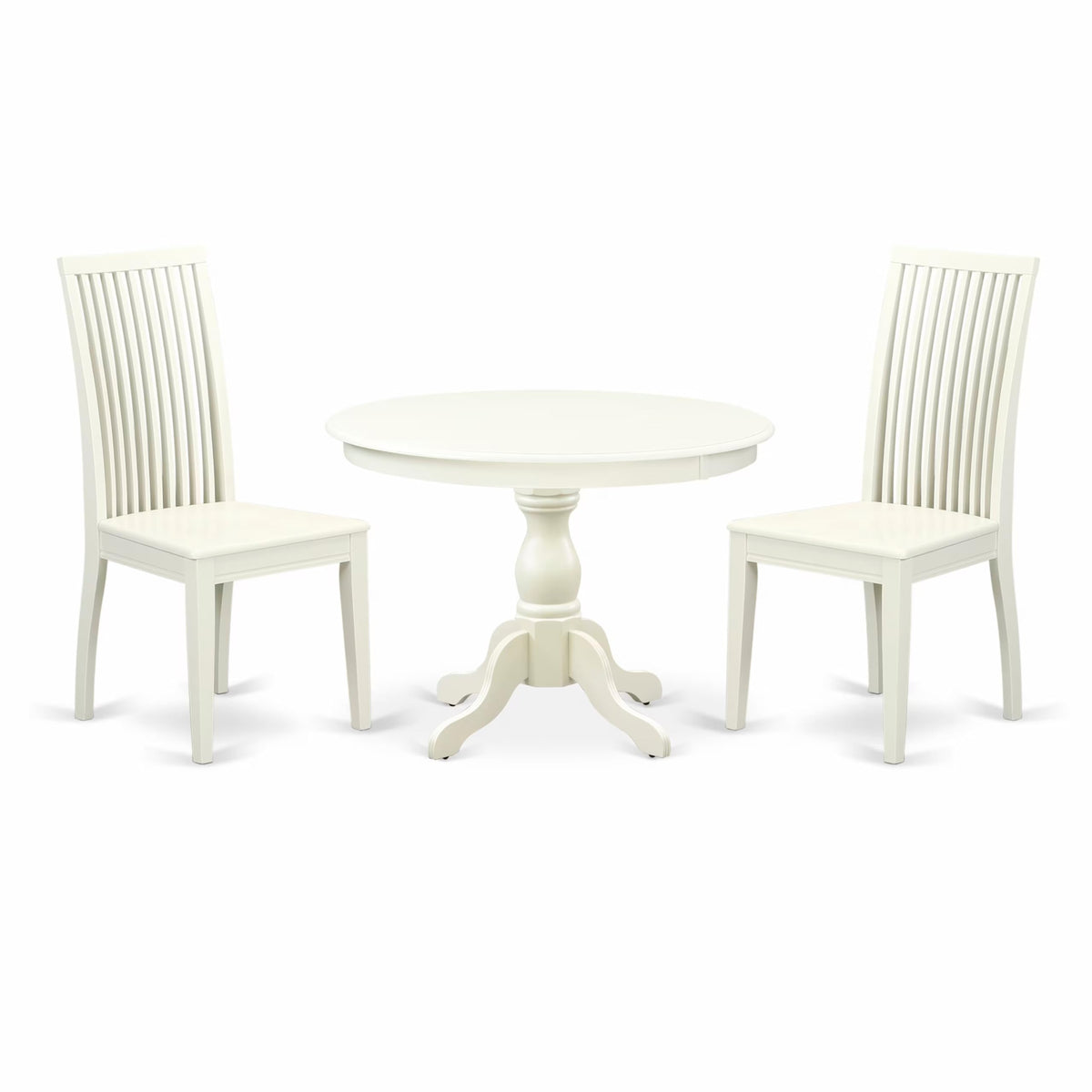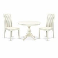 EAST WEST FURNITURE - HBIP3-LWH-W - 3-Pc KITCHEN SETIntroducing our 3-Piece modern dining table set, featuring a round dining table and 2 dining room chairs, providing ample seating for your family. This kitchen dining table set showcases a sophisticated and eye-catching appearance. The elegant design and Rustic, Linen white dining room chairs are the perfect match for any dining room. Transform your home decor with our antique-style dining table set. The Linen White textured finish adds a unique allure to your dining room, while the wooden legs of both the kitchen and dining room chairs, as well as the wood table, enhance their solidity and traditional feel. The modern style of the table and chairs dining set brings a touch of elegance to your home, ensuring you and your family will absolutely enjoy it. Our kitchen chairs offer a fantastic and relaxing experience with their slatted backrests and cone-shaped legs. Featuring a smooth surface, this dining table set for two is easy to keep clean by simply wiping it down, ensuring hassle-free maintenance. Assembly of our kitchen set is quick and easy, requiring only a short amount of time when following the step-by-step instructions provided.PRODUCT FEATURES: Wood Type: Asian Wood Wooden Dining Chairs Legs Color: Linen White Kitchen Chairs Back Style: Slatted Back Small Dining Table Top Color: Linen White Wood Table Legs Color: Linen White Wood Chairs Dimension: Length: 21; Width: 18; Height: 39. Dimension of Wood Table: Length: 42; Width: 42; Height: 29.5.Included: 1 Dining Table and 2 Dining Chairs.