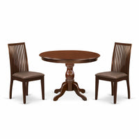 EAST WEST FURNITURE - HBIP3-MAH-C - 3-Pc KITCHEN SETIntroducing our 3-Piece kitchen set, featuring a round breakfast table and 2 dining chairs, providing ample seating for your family. This table set boasts a sophisticated and captivating appearance. The elegant design and Rustic, Mahogany wood chairs are the perfect match for any dining room. Refresh your interior decor with our traditional style modern dining table set. The Mahogany textured finish adds a distinctive allure to your dining area, while the wooden legs of both the kitchen chair and breakfast table enhance their solidity and traditional feel. The modern style of the table and chairs dining set brings a touch of elegance to your home, ensuring you and your family will absolutely enjoy it. The wooden dining chair provides a fantastic relaxing experience with its slatted backrest and cone-shaped legs. Our modern dining chairs are equipped with Zig Zag springs, constructed from 2-dimensional S-shaped wires, also known as No-Sag springs. These high carbon steel springs provide sturdy support to the seat in any suspension and can handle the weight with ease. Featuring a smooth surface, this dining table set for two is easy to clean with a simple wipe-down, ensuring hassle-free maintenance. Assembling our dining table set is quick and easy, requiring only a short amount of time when following the step-by-step instructions provided.PRODUCT FEATURES: Wood Type: Asian Wood Kitchen Chair Legs Color: Mahogany Wooden Dining Chairs Back Style: Slatted Back Breakfast Table Top Color: Mahogany Wood Table Legs Color: Mahogany Wood Chairs Dimension: Length: 21; Width: 18; Height: 39. Dimension of Modern Dining Table: Length: 42; Width: 42; Height: 29.5.Included: 1 Pedestal Wood Dining Table and 2 Kitchen Dining Chairs.