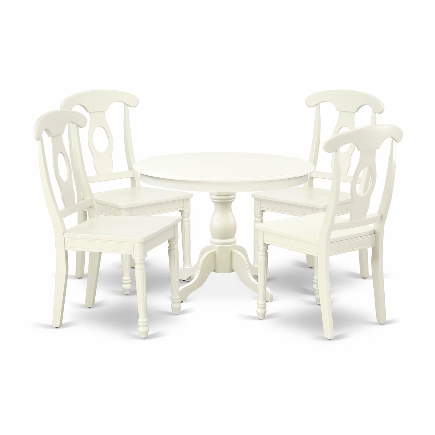 EAST WEST FURNITURE - HBKE5-LWH-W - 5-Pc MODERN DINING TABLE SETIntroducing our 5-Piece kitchen dining table set, which includes a round wooden table and 4 dining room chairs, providing ample seating for your family. This kitchen set showcases an elegant and captivating design that will enhance the visual appeal of any dining space. The chairs, with their rustic linen white wood finish, perfectly complement any dining room decor. Elevate your home aesthetics with our charming rustic design dining set. The linen white textured finish adds a distinctive charm to your dining area, while the sturdy wooden legs of both the chairs and table contribute to a solid and traditional feel. The modern style of this dining room set adds a touch of sophistication that you and your family will truly appreciate. Our kitchen chairs offer a delightful seating experience with their Napoleon backrests and cone-shaped legs. Additionally, the smooth surface of the dining table set facilitates easy cleaning with a simple wipe-down, ensuring hassle-free maintenance. Assembling our dining room set is a breeze, requiring only a short amount of time when following the step-by-step instructions.PRODUCT FEATURES: Wood Type: Asian Wood Chairs Back Style: Napoleon Back Color: Linen White Chairs Dimension: Length: 21; Width: 18; Height: 38. Dimension of Table: Length: 42; Width: 42; Height: 29.5.Include: 1 Kitchen Table and 4 Dining Room Chairs.