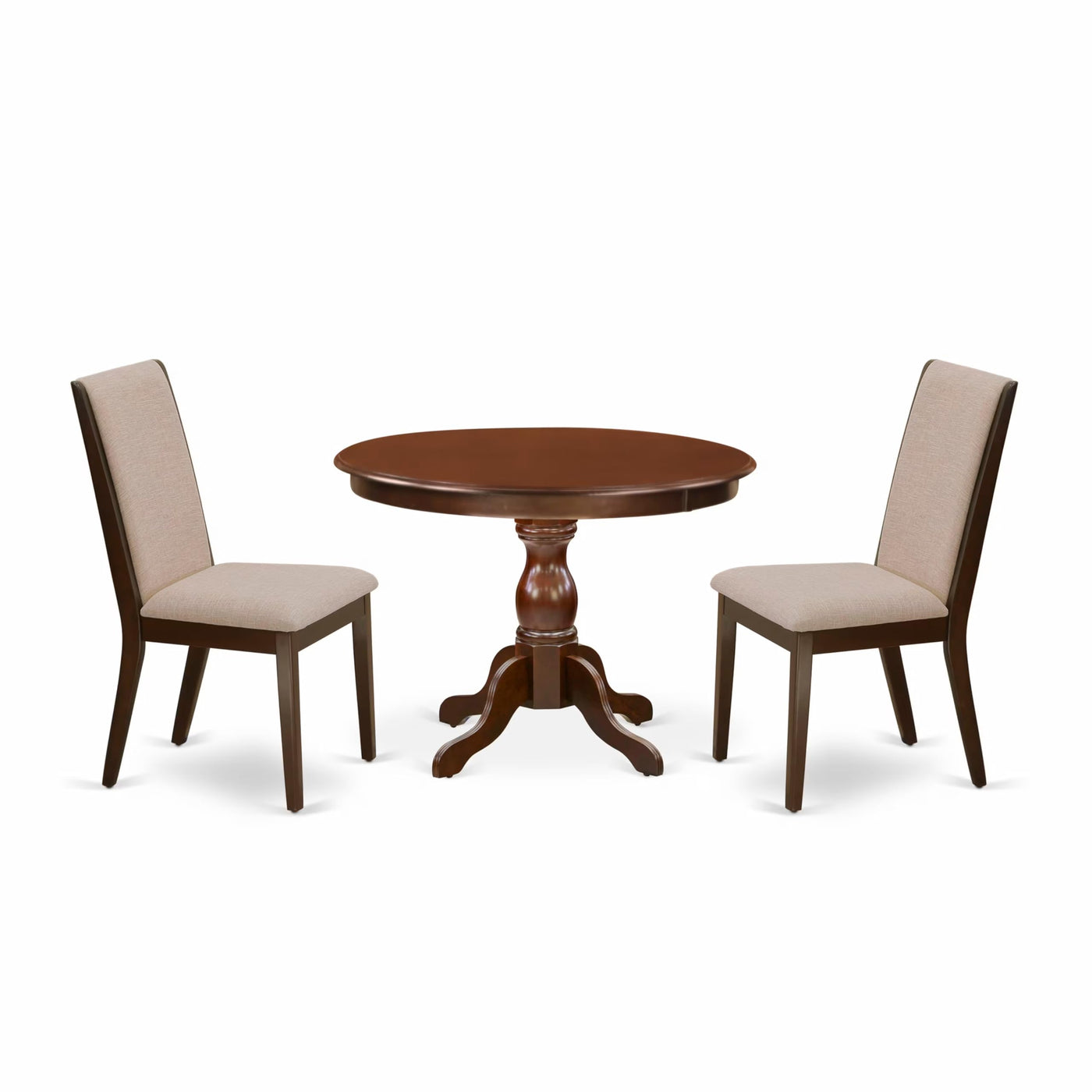 EAST WEST FURNITURE - HBLA3-MAH-04 - 3-PC KITCHEN SETIntroducing our 3-piece dining room set, consisting of a round dining table and 2 kitchen chairs that provide ample seating for your family. This kitchen table set boasts a sophisticated and captivating design. The elegant design and Traditional, Mahogany upholstered dining chairs are perfect for enhancing any dining room. Elevate your home decor with our rustic-style dining set. The Mahogany textured finish adds a unique allure to various dining rooms, while the wooden legs of both the Dining Chairs and Dining Table enhance their sturdiness and traditional charm. The contemporary style of this kitchen set brings a touch of elegance to your kitchen, creating an enjoyable experience for you and your family. The kitchen chairs offer incredible comfort with their high back and cone-shaped legs. Our modern dining chairs feature Zig Zag springs, also known as No-Sag springs, crafted from 2-dimensional S-shaped wires. These high-carbon steel springs provide exceptional durability and weight support. With its smooth surface, our dining table set is easy to clean with a simple wipe down, ensuring hassle-free maintenance. Assembling our modern dining table set is quick and straightforward, following the step-by-step guidelines provided.PRODUCT FEATURES: Fabric Type: Linen Fabric Linen Fabric Color: Light Tan Modern Dining Table Top Color: Mahogany Dining Room Table Legs Finish: Mahogany Mid Century Modern Chair Legs Color: Mahogany Kitchen Chairs Back Style: High Back Upholstered Dining Chairs Dimension: Length: 22; Width: 20; Height: 39. Dimension of Dining Table: Length: 42; Width: 42; Height: 29.5.Included: 1 Modern Dining Table and 2 Dining Chairs.