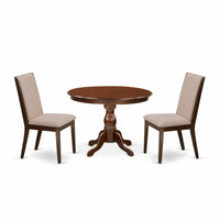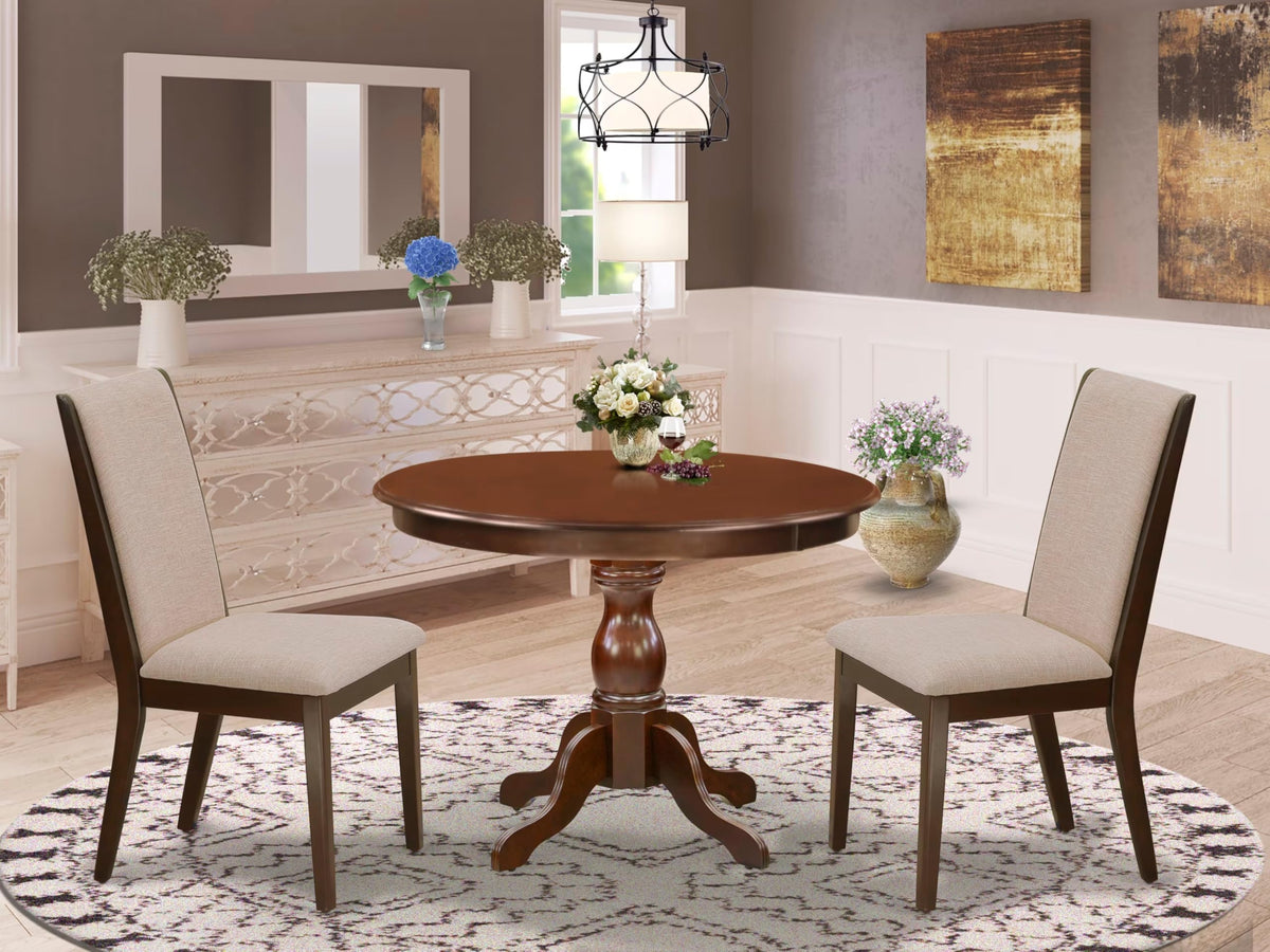 East West Furniture HBLA3-MAH-04 3 Piece Dining Room Table Set Contains a Round Dining Table with Pedestal and 2 Light Tan Linen Fabric Upholstered Parson Chairs, 42x42 Inch, Mahogany