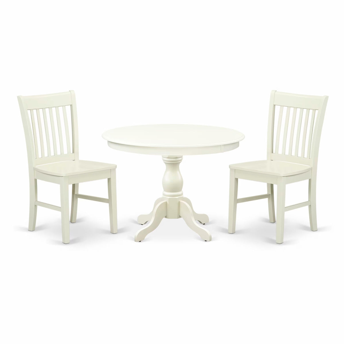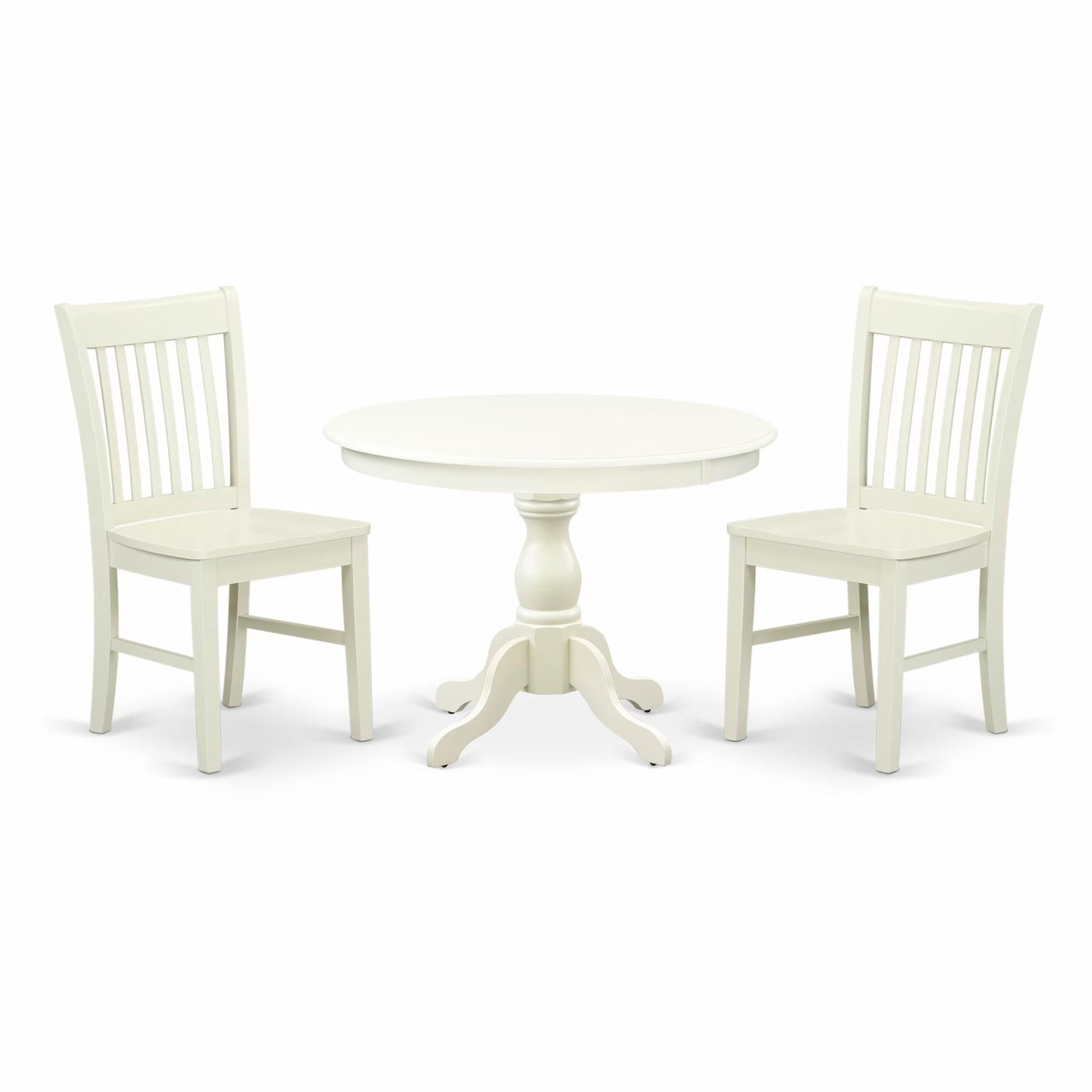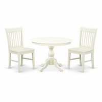 EAST WEST FURNITURE - HBNF3-LWH-W - 3-Pc KITCHEN SETIntroducing our 3-Piece dining room set, which includes a small round kitchen table and 2 wooden chairs, perfectly accommodating your entire family. This kitchen dining table set boasts an elegant and captivating appearance. Its classy design, combined with rustic linen white wood chairs, makes it a versatile match for any dining room. Elevate your interior decor with this traditional yet modern dining table set. The linen white textured finish adds a unique charm to any dining area, while the wooden legs of both the chairs and table contribute to their sturdy and traditional appeal. The modern style of this kitchen set brings an element of sophistication to your home, creating an enjoyable atmosphere for you and your family. Our kitchen and dining room chairs provide an incredibly relaxing experience with their slatted backrests and cone-shaped legs. The smooth surface of our dining table set allows for easy cleaning with a simple wipe down, ensuring hassle-free maintenance. Assembling our kitchen table set is a breeze, as it requires minimal time and can be easily accomplished by following the step-by-step instructions.PRODUCT FEATURES: Wood Type: Asian Wood Kitchen Chair Legs Color: Linen White Kitchen Chair Back Style: Slatted Back Small Dining Table Top Color: Linen White Round Dining Table Legs Color: Linen White Dining Room Chairs Dimension: Length: 19; Width: 18; Height: 35. Dimension of Dinner Table: Length: 42; Width: 42; Height: 29.5.Included: 1 Small Kitchen Table and 2 Kitchen Chair.