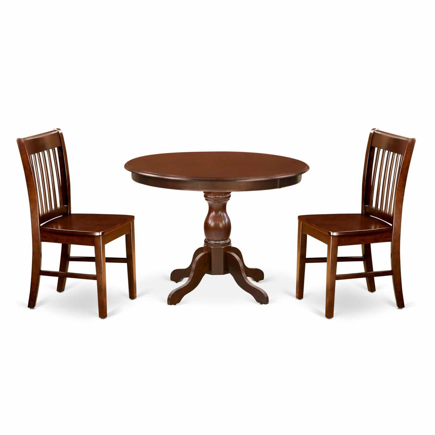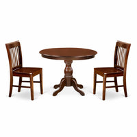 EAST WEST FURNITURE - HBNF3-MAH-W - 3-Pc DINING ROOM TABLE SETIntroducing our 3-Piece kitchen dining table set, consisting of a round dining table and 2 kitchen chairs, perfect for accommodating your entire family. This table set boasts a sophisticated and captivating appearance. The elegant design and rustic, mahogany dining room chairs make it a perfect match for any dining room. Elevate your home decor with our modern dining table set in a rustic style. The mahogany textured finish adds a unique charm to any dining area, while the wooden legs of the kitchen chairs and small dining table enhance their sturdiness and provide a traditional feel. The contemporary style of this kitchen dining table set adds an elegant touch to your home that you and your family will enjoy. Our wooden dining chairs offer a fantastic and relaxing experience with their slatted back and cone-shaped legs. The smooth surface of the dining table set makes it easy to clean with a simple wipe down, ensuring hassle-free maintenance. Assembling our dining set is quick and easy if you follow the step-by-step guidelines provided.PRODUCT FEATURES: Wood Type: Asian Wood Dining Chairs Legs Color: Mahogany Chairs for Dining Room Back Style: Slatted Back Dinning Table Top Color: Mahogany Small Dining Table Legs Color: Mahogany Wooden Chairs Dimension: Length: 19; Width: 18; Height: 35. Dimension of Kitchen Table: Length: 42; Width: 42; Height: 29.5.Included: 1 Kitchen Table and Chairs and 2 Chairs for Dining Room.