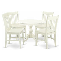 EAST WEST FURNITURE - HBNF5-LWH-W - 5-Pc KITCHEN DINING TABLE SETIntroducing our 5-Piece dining set, which includes a round dining room table and 4 chairs designed to comfortably accommodate your family. This dining room table set showcases an exquisite and captivating appearance, boasting an elegant design that perfectly complements any dining room. The Rustic, Linen white kitchen chairs add a touch of sophistication to match your decor. Enhance your home's aesthetics with our traditional-style dining set, as the Linen White textured finish adds a unique charm to any dining area. The sturdy wooden legs of both the kitchen chairs and the small dining table contribute to a solid and traditional feel. Experience a touch of modern elegance with this kitchen table set that you and your family will surely appreciate. Our dining room chairs provide an incredibly relaxing experience with their slatted backrests and cone-shaped legs. Additionally, the smooth surface of this dining table set allows for hassle-free maintenance—simply wipe it down to keep it clean. Assembling our dining set is a breeze, requiring only a short amount of time when following the step-by-step guidelines.PRODUCT FEATURES: Wood Type: Asian Wood Kitchen Chairs Legs Color: Linen White Kitchen Chairs Back Style: Slatted Back Dining Table Top Color: Linen White Small Kitchen Table Legs Color: Linen White Wooden Dining Chairs Dimension: Length: 19; Width: 18; Height: 35. Dimension of Wood Table: Length: 42; Width: 42; Height: 29.5.Included: 1 Dining Table and 4 Wooden Chairs.