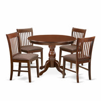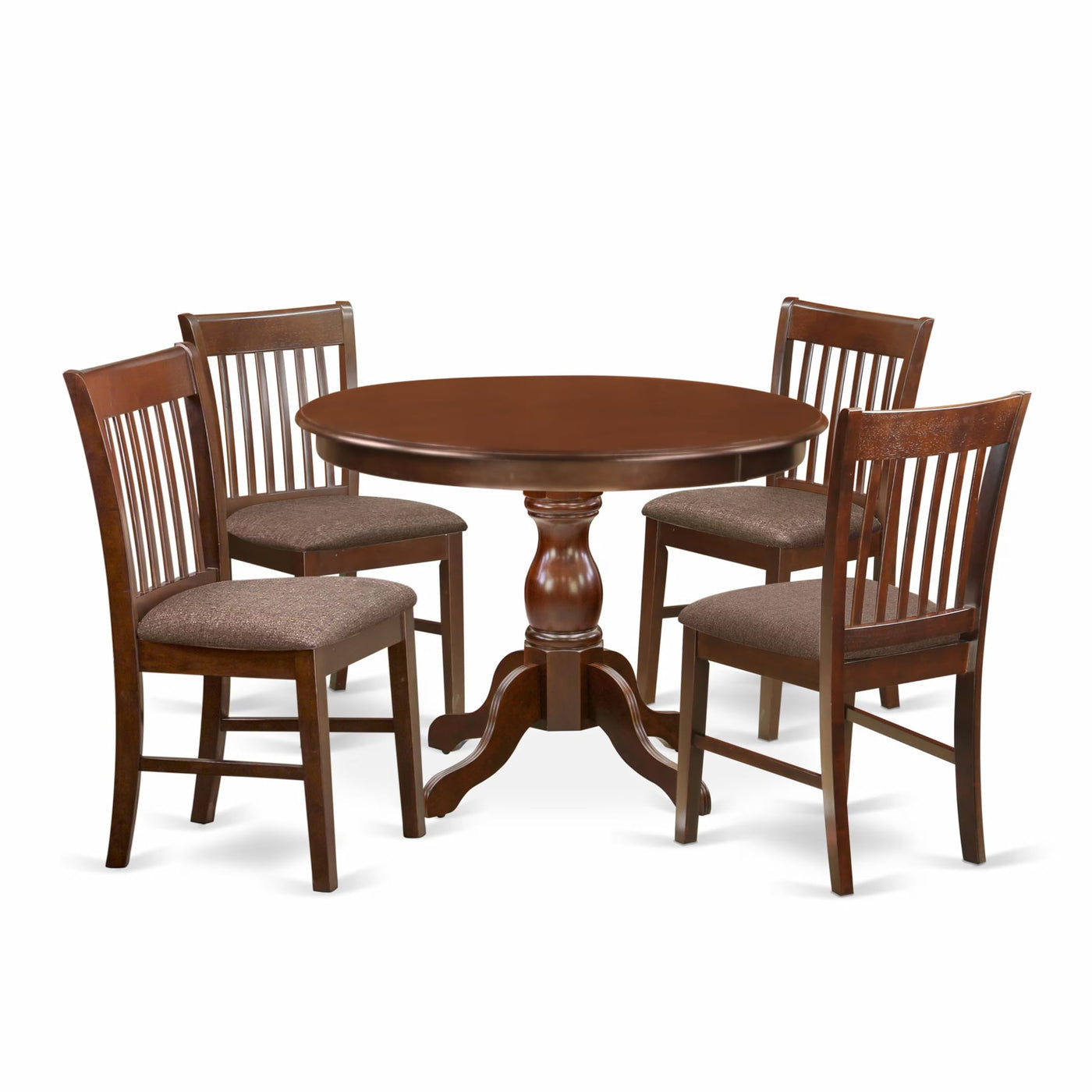 EAST WEST FURNITURE - HBNF5-MAH-C - 5-Pc kitchen SETIntroducing our 5-Piece dining room table set, which consists of a round dining table and 4 kitchen chairs, providing ample space for your entire family. This kitchen set boasts an elegant and captivating appearance, with a classy design and rustic mahogany kitchen chairs that effortlessly complement any dining room. Transform your interior decor with our rustic table set, as the mahogany textured finish adds a unique charm to any dining space. The wooden legs of both the chairs and table contribute to their solidity and traditional appeal, allowing you to enhance the overall ambiance. The contemporary style of this kitchen table set adds a touch of sophistication to your home, providing an enjoyable dining experience for you and your family. Our kitchen chairs are designed for incredible relaxation, featuring a slatted back and cone-shaped legs. The dining table set features a smooth surface, making it easy to clean with a simple wipe down, ensuring hassle-free maintenance. Assembly is a breeze, as the step-by-step guidelines make it simple and time-efficient to set up the table set.PRODUCT FEATURES: Wood Type: Asian Wood Wooden Chairs Legs Color: Mahogany Wood Chairs Back Style: Slatted Back Wood Table Top Color: Mahogany Modern Dining Table Legs Color: Mahogany Wooden Chairs Dimension: Length: 19; Width: 18; Height: 35. Dimension of Dinner Table: Length: 42; Width: 42; Height: 29.5.Included: 1 Pedestal Kitchen Table and 4 Wooden Chairs.