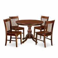 EAST WEST FURNITURE - HBNF5-MAH-W - 5-Pc KITCHEN TABLE SETIntroducing our 5-Piece kitchen table set, which includes a round kitchen table and 4 dining room chairs, providing ample seating for your entire family. This dining set boasts a sophisticated and captivating appearance. The elegant design and rustic, mahogany wooden dining chairs make them a perfect match for any dining room. Enhance your interior decor with this traditional-style kitchen table set, featuring a mahogany textured finish that adds a unique allure to any dining area. The wooden legs of both the dining room chairs and the modern dining table contribute to their sturdiness and traditional charm. The contemporary style of this dining set adds a touch of elegance to your home, creating an enjoyable atmosphere for you and your family. Our dining room chairs are designed for utmost comfort, featuring a slatted back and cone-shaped legs. The dining table set has a smooth surface, making it easy to clean with a simple wipe down, ensuring hassle-free maintenance. Assembly of this dining table set is quick and straightforward, with step-by-step instructions provided for your convenience.PRODUCT FEATURES: Wood Type: Asian Wood Dining Room Chairs Legs Color: Mahogany Chairs for Dining Room Back Style: Slatted Back Dinner Table Top Color: Mahogany Kitchen Table Legs Color: Mahogany Wooden Dining Chairs Dimension: Length: 19; Width: 18; Height: 35. Dimension of Dining Table: Length: 42; Width: 42; Height: 29.5.Included: 1 Dinner Table and 4 Chairs for Dining Room.