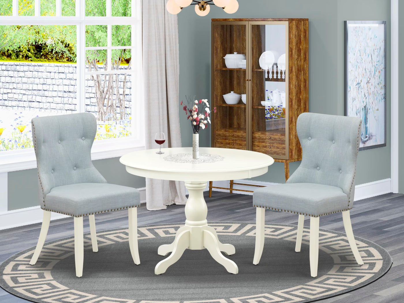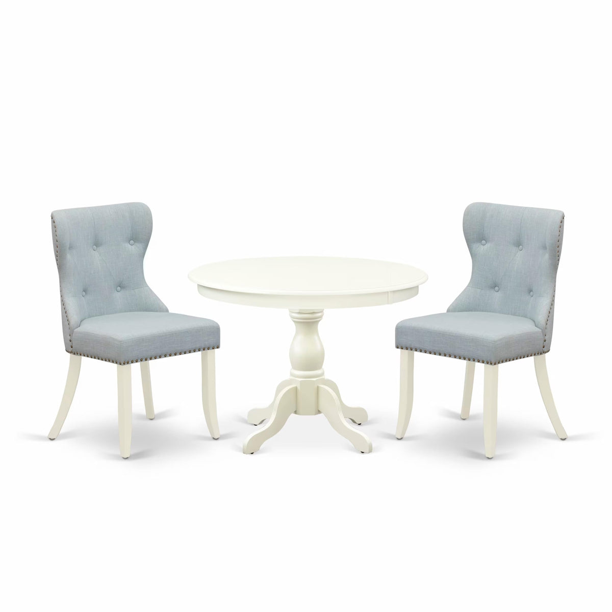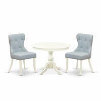 EAST WEST FURNITURE - HBSI3-LWH-15 - 3-PIECE DINING TABLE SETIntroducing our 3-Piece dining set, consisting of a round wooden table and 2 Parson Dining Chairs, designed to comfortably accommodate your entire family. This kitchen set showcases a captivating and innovative appeal, with its classy design and Rustic, Linen White upholstered dining chairs, making it a perfect match for any dining room. The wooden legs of both the Parson Dining Chairs and the kitchen table enhance the overall solidity and traditional feel. The compact dinner table features a Linen White finish on its surface and supporting legs. Similarly, our modern chairs have a Baby Blue seat color, with legs also finished in Linen White. These chairs provide exceptional comfort and serve as a striking alternative to traditional seating options. With its contemporary style, this dining set adds a touch of elegance to your kitchen, providing you and your loved ones with an enjoyable dining experience. Our modern chair ensures incredible comfort, featuring a button-tufted back and cone-shaped legs. These mid-century modern chairs are equipped with Zig Zag springs, also known as No-Sag springs, which are made from high carbon steel and offer excellent support and durability. Assembling our dining room table set is quick and easy, as long as you follow the step-by-step guidelines provided.PRODUCT FEATURES: Fabric Type: Linen Fabric Linen Fabric Color: Baby Blue Dining Table Top Color: Linen White Dinner Table Finish: Linen White Dining Room Chairs Legs Color: Linen White Modern Dining Chairs Back Style: Button Tufted Back Upholstered Dining Chairs Dimension: Length: 21.5; Width: 19.5; Height: 35.5. Dimension of Small Kitchen Table: Length: 42; Width: 42; Height: 29.5.Included: 1 Pedestal Wood Table and 2 Kitchen Chairs.