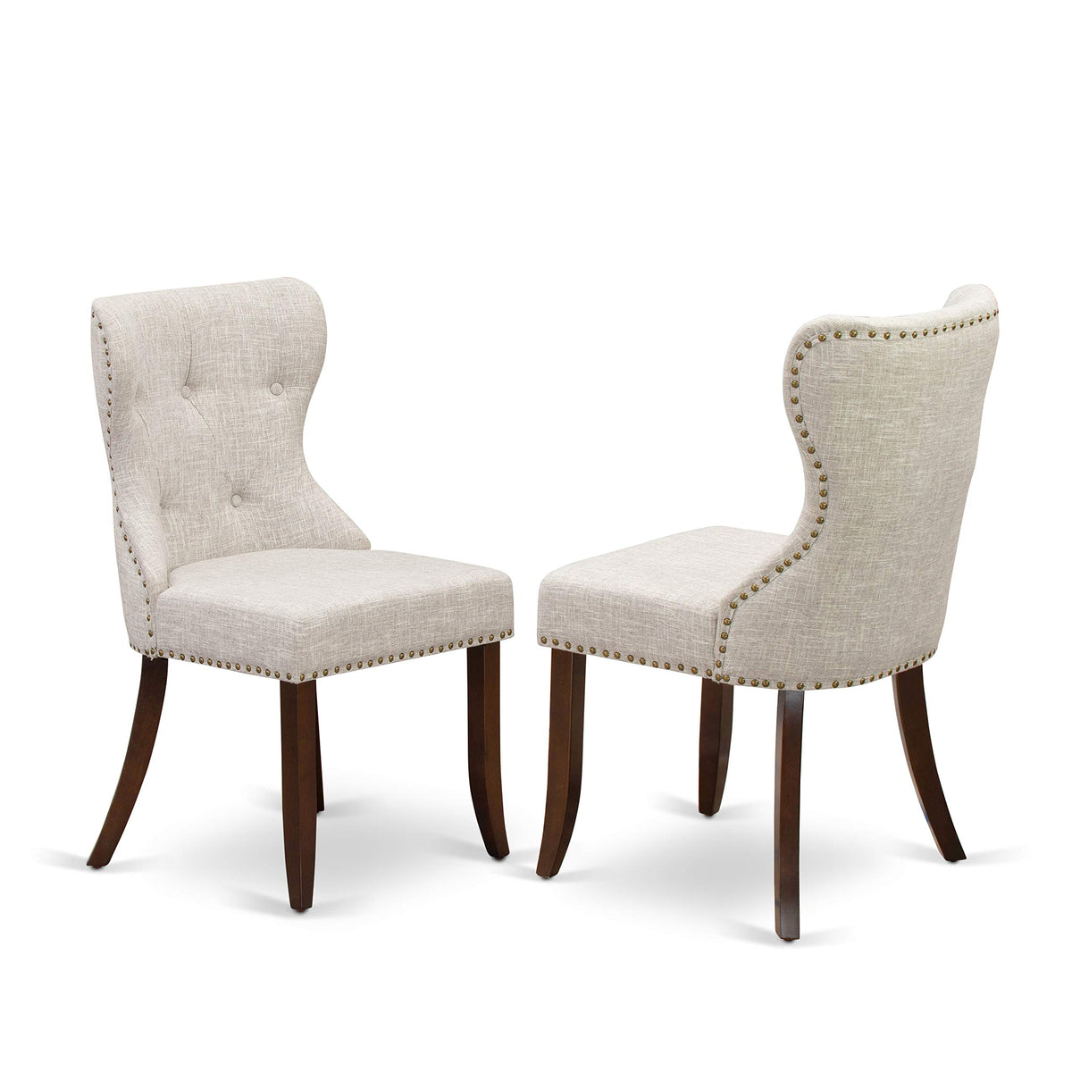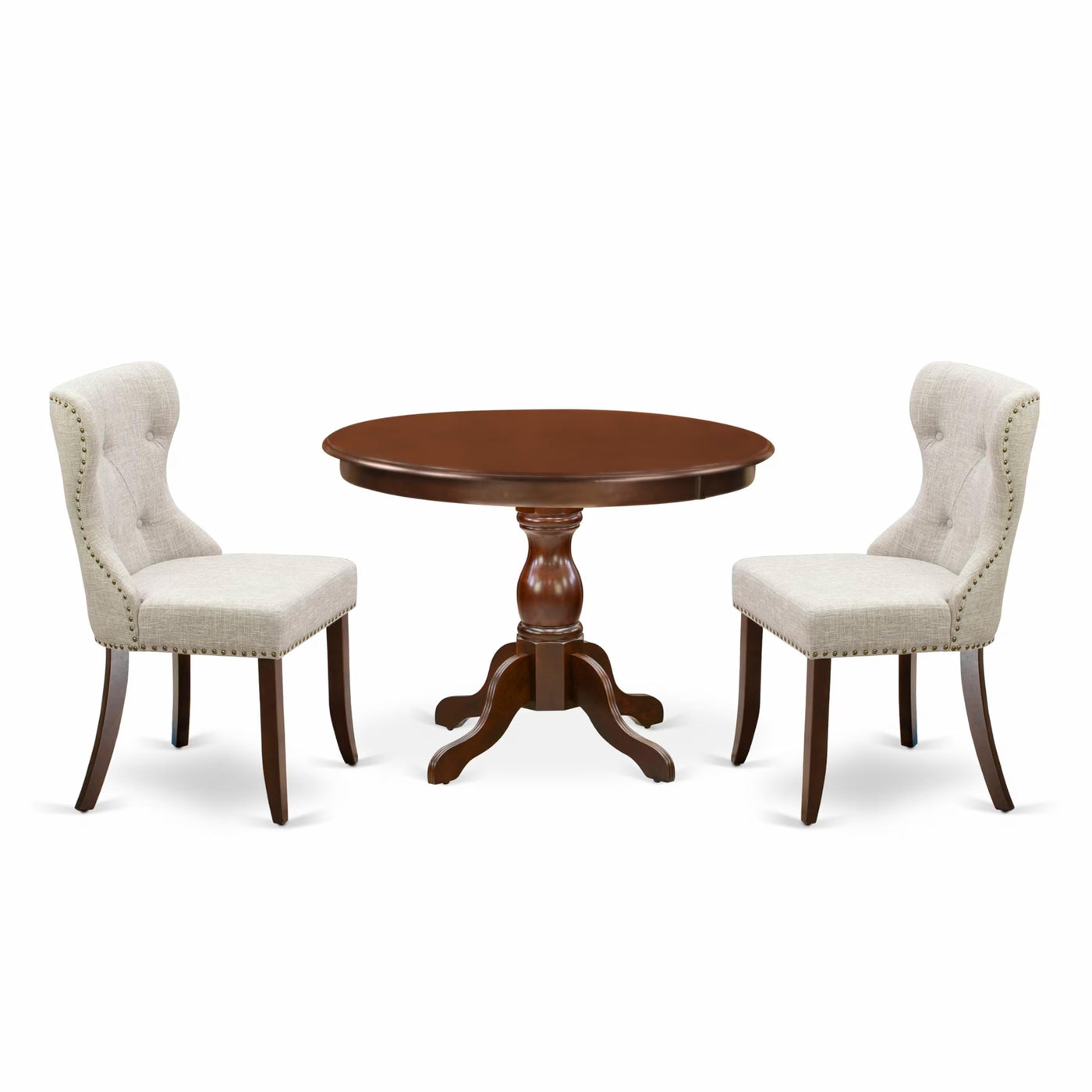 EAST WEST FURNITURE - HBSI3-MAH-35 - 3-PIECE TABLE SETIntroducing our 3-Piece dining set, which includes a small round dining table and 2 Parson Dining Chairs, perfectly accommodating your family. This dining room table set showcases an elegant and appealing design, adding a touch of sophistication to your space. The traditional Mahogany dining chairs beautifully complement any room, enhancing your interior decor with a rustic charm. The Mahogany textured finish adds a unique allure to various dining rooms, while the sturdy wooden legs of both the kitchen and dining chairs, as well as the dining table, provide a solid and classic feel. The modern style of this dining table set brings an element of elegance to your home, providing you and your loved ones with a delightful dining experience. Our dining room chairs offer exceptional comfort with their button-tufted back and cone-shaped legs. The upholstered dining chairs feature Zig Zag springs, also known as No-Sag springs, made from high carbon steel wires in a two-dimensional S-shape, ensuring both durability and weight support. With its smooth surface, this dining table set is easy to clean with a simple wipe-down, allowing for hassle-free maintenance. Assembling the dining table set is a quick and straightforward process when following the provided step-by-step instructions.PRODUCT FEATURES: Fabric Type: Linen Fabric Linen Fabric Color: Doeskin Dining Table Top Color: Mahogany Dining Table Finish: Mahogany Dining Chair Legs Color: Mahogany Dining Room Chairs Back Style: Button Tufted Back Kitchen and Dining Room Chairs Dimension: Length: 21.5; Width: 19.5; Height: 35.5. Dimension of Dinner Table: Length: 42; Width: 42; Height: 29.5.Included: 1 Pedestal Small Kitchen Table and 2 Modern Chairs.