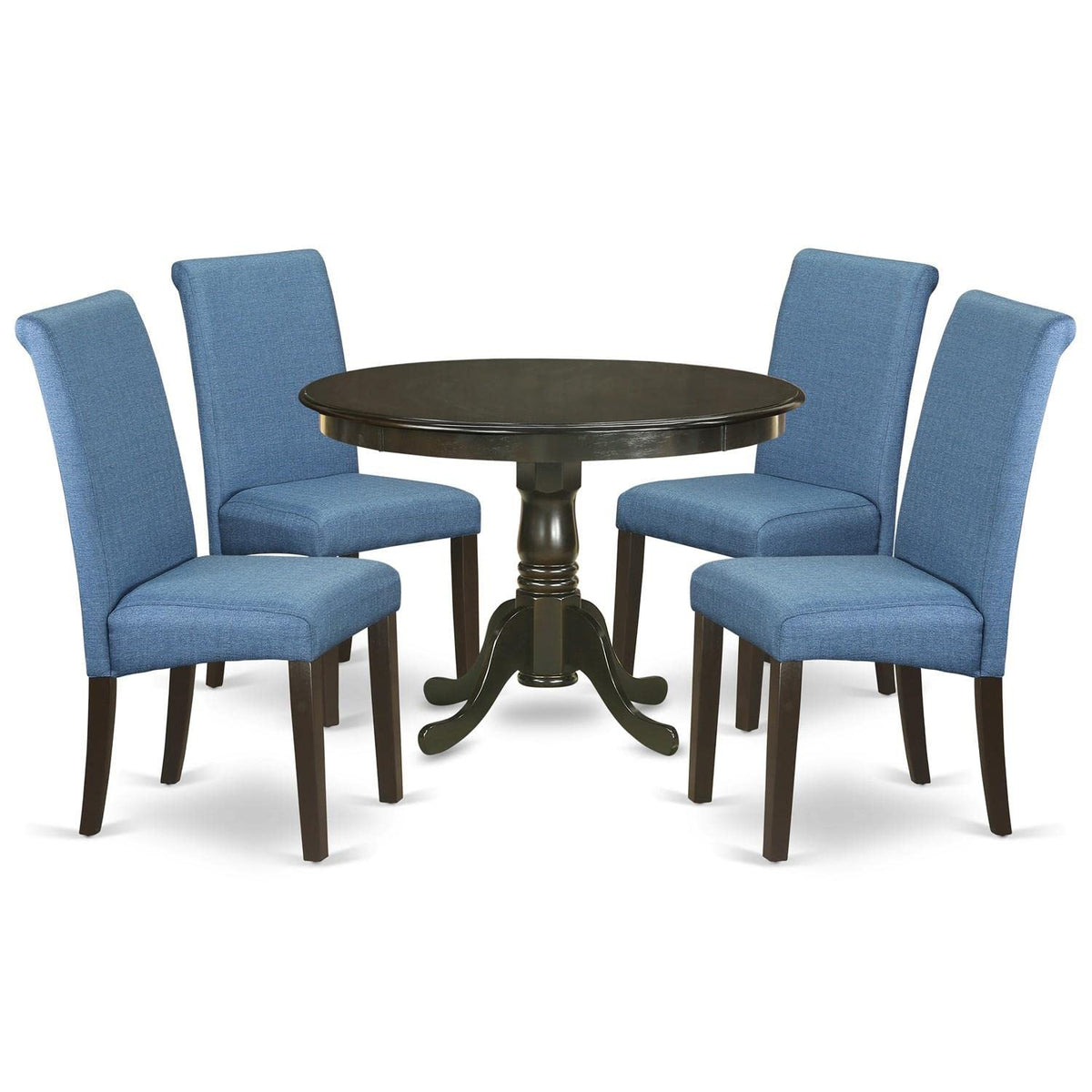 East West Furniture - Hlba5-Cap-21 - Dining Table Setthis Particular Dining Set Will Apply A Remarkable Atmosphere To Your Kitchen Space Through Its Dark Slick Facets. The Round Small Dining Table Provides A Distinct, Sleek Cappuccino Finish Well-Fitted To Any Sort Of Home Decoration Style. The Fresh And Clean Lines Dominate The Cutting-Edge Design Of The Oval Kitchen Dinette Table. The Barry Upholstered Dining Chair Is Elegant & Classic In Design, Comfortable & Spacious To Seat And Serves The Best Of Its Purpose. 60% Cotton, 40% Polyester Linen Fabric Cushion Material Is Durable, Easy To Clean And Neutral In Color To Match Any Decor. The Roll Back Design Parson Chair Frame Is Made Of Cappuccino Color Sturdy Hardwood Materials Which Provide Sound Stability And Functionality.Product Features Material: Asian Hardwood Table Color: Cappuccino Chair Fabric: Linen Fabric Cushion Material: Foam Fabric Color: Blue Chair Leg Color: Cappuccino Chair Dimensions: Length 22.5; Width 18; Height 38.5 Table Dimensions: Length 42; Width 42; Height 29.5” Weight Capacity: 300 Lbsincluded In The Package: Kitchen Table And 4 Dining Room Chairs.