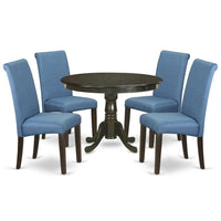 East West Furniture Hlba5-Cap-21 5 Piece Dining Room Table Set Includes A Round Kitchen Table With Pedestal And 4 Blue Color Linen Fabric Parson Dining Chairs, 42X42 Inch, Cappuccino