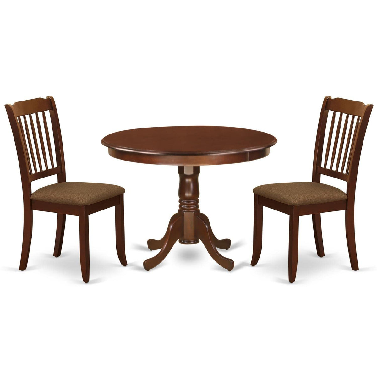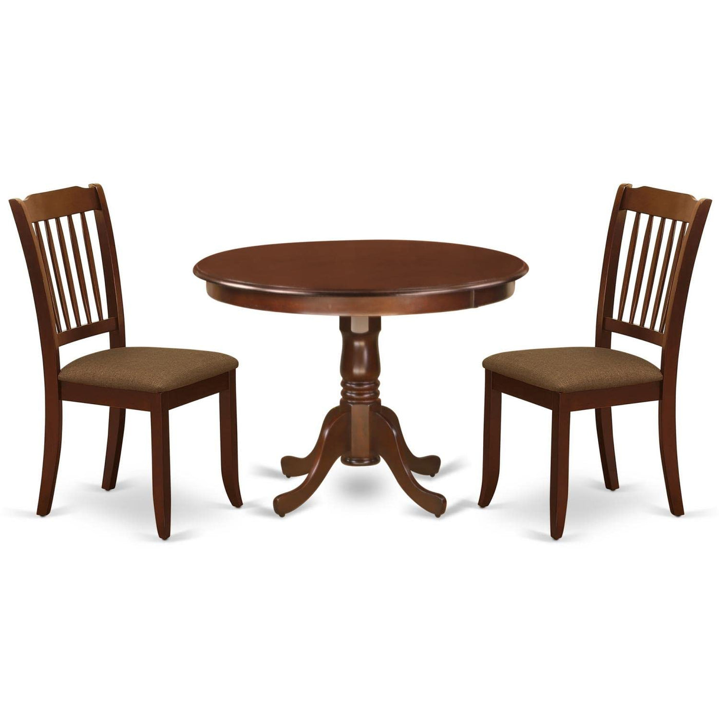 East West Furniture - Hlda3-Mah-C 3-Piece Dining Table Setadd A Touch Of Elegance To Your Dining Room With The 3-Piece Dining Room Set. This Set Includes 2 Linen Fabric Dining Chairs And A Fantastic Round Dining Room Table. The Round Dining Table Showcases A Round Shape And 4 Gorgeous Wooden Pedestal Legs, Adding To Its Allure. Both The Round Dining Table And Dining Chairs Are Painted With A High-Quality Mahogany Color, Exuding Sophistication. The Dining Table Is Versatile And Perfect For Various Dining Occasions. The Dining Room Chairs Feature A High Slatted Back, Mahogany Linen Fabric Seats, And Beautiful Wooden Legs. Designed For Easy Maintenance And Everyday Use, The Mid-Century Dining Chairs Come In A Mahogany Finish. Constructed From Durable Asian Hardwood, The Round Dining Room Table And Wooden Dining Room Chairs Are Built To Last And Offer A Timeless Aesthetic. This Kitchen Set Is Well-Crafted And Renowned For Its Suitability In Modern Homes. Bringing This Beautiful Dining Table Set Home Will Surely Be A Delight. The Breakfast Table And Kitchen Dining Chairs Can Be Utilized In Both The Dining Room And Kitchen Areas. They Accommodate All Meals And Can Be Conveniently Moved Under The Modern Dining Table After Dinner To Create More Space In The Dining Area. The Linen Fabric Dining Chairs Provide Comfort And Style For Dinner, Lunch, Or Breakfast With Your Family, Friends, And Guests, Enhancing The Ambiance Of Your Dining Room. Assembling The Modern Kitchen Table And Wooden Chairs Is A Breeze, And If You Have Any Questions, Please Don'T Hesitate To Contact Us. Purchase Our Products With Confidence, As Customer Satisfaction Is Our Top Priority.Product Features: Frame Material: Asian Wood Linen Fabric Chairs Seat Color: Mahogany, Wooden Dining Chairs Size: Length: 22; Width: 18; Height: 38. Kitchen Dining Table Color: Mahogany, Breakfast Table Dimensions: Length: 42; Width: 42; Height: 29.5.Included: An Attractive Modern Round Dining Table And 2 Fantastic Dining Room Chairs.
