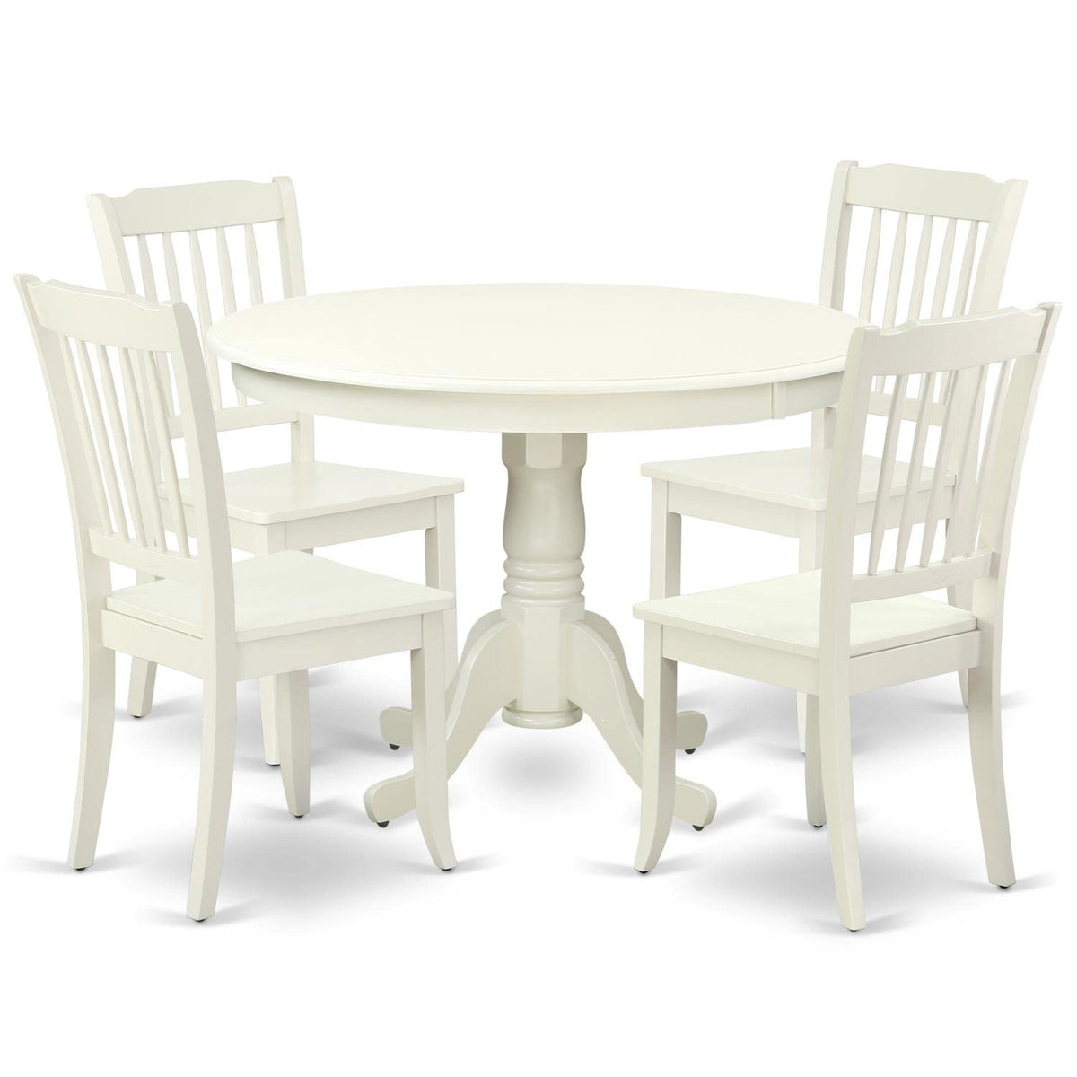 East West Furniture - Hlda5-Lwh-W 5-Piece Dining Table Setenhance The Elegance Of Your Dining Room With The 5-Pc Kitchen Table And Chairs Set. This Set Includes A Round Magnificent Round Table And 4 Solid Wood Dining Chairs. The Dinner Table Features A Round Shape And Is Supported By Four Lovely Wooden Legs. Both The Modern Kitchen Table And The Kitchen Dining Chairs Are Coated With A High-Quality Linen White Color, Adding A Touch Of Sophistication. The Dining Room Chairs Feature High Slatted Backs, Linen White Solid Wood Seats, And Beautiful Legs, Offering Both Comfort And Style. With A Linen White Finish, These Wood Chairs Are Easy To Maintain And Suitable For Everyday Use. Constructed From Premium Quality Rubber Wood, The Round Breakfast Table And Wood Dining Chairs Are Sturdy And Durable, Providing A Conventional Look. This Well-Designed Dining Table Set Is Renowned For Its Suitability In Modern Homes. You'Ll Be Delighted To Bring This Beautiful Dining Room Set Home, As It Can Be Used In Both Dining Areas And Kitchens. The Wooden Dining Table Is Flexible And Perfect For Various Dining Occasions. Assembly Of The Dining Room Table And Wooden Dining Room Chairs Is A Hassle-Free Task, And If You Have Any Questions Or Concerns, Our Customer Service Team Is Always Available To Assist You. Purchase Our Products With Confidence, As Customer Satisfaction Is Our Top Priority.Product Features: Frame Material: Asian Wood Dining Chairs Color: Linen White Dining Table Color: Linen White Wooden Chairs Measurements: Length: 22; Width: 18; Height: 38. Dining Table Size: Length: 42; Width: 42; Height: 29.5.Included: An Amazing Breakfast Table And 4 Great Kitchen Dining Chairs.