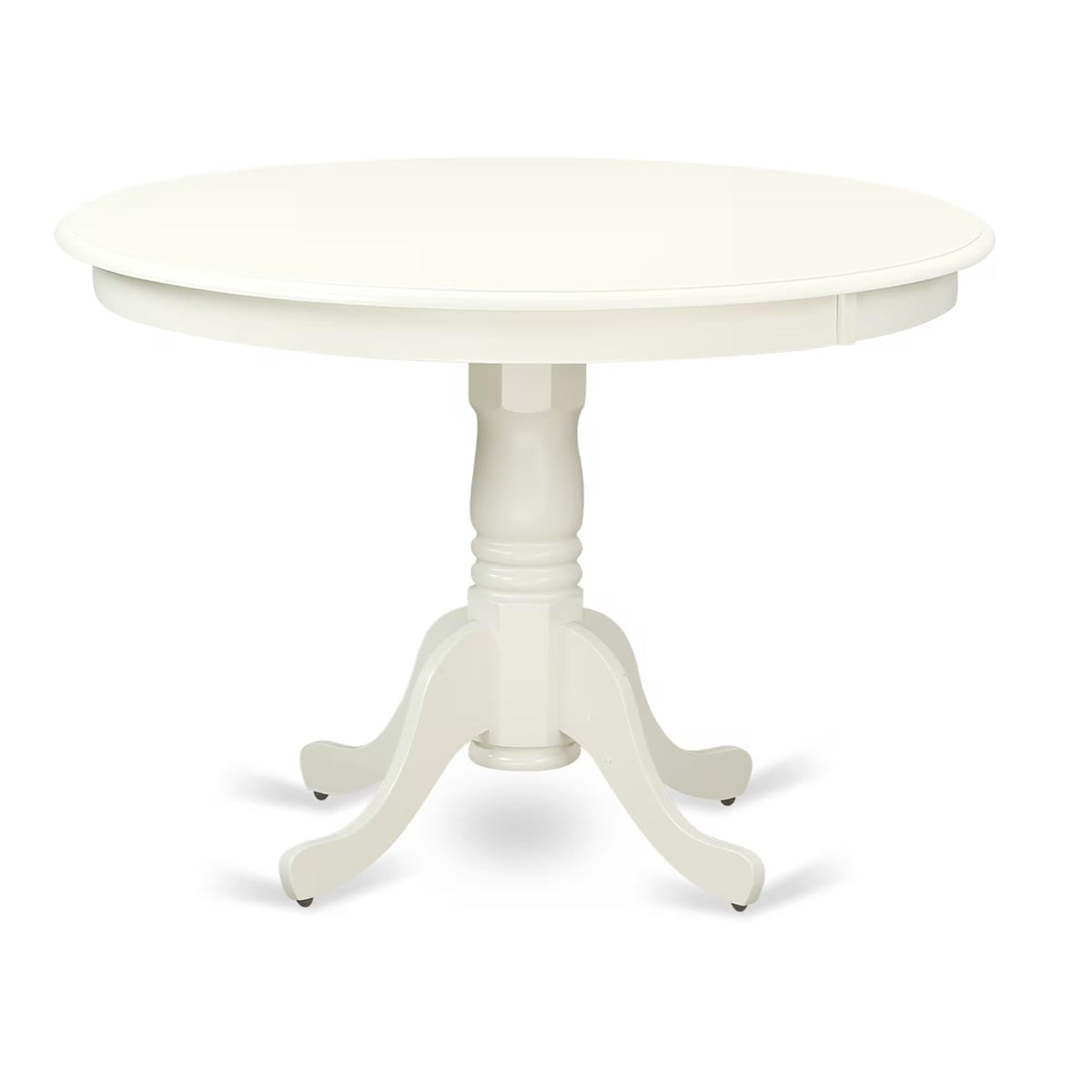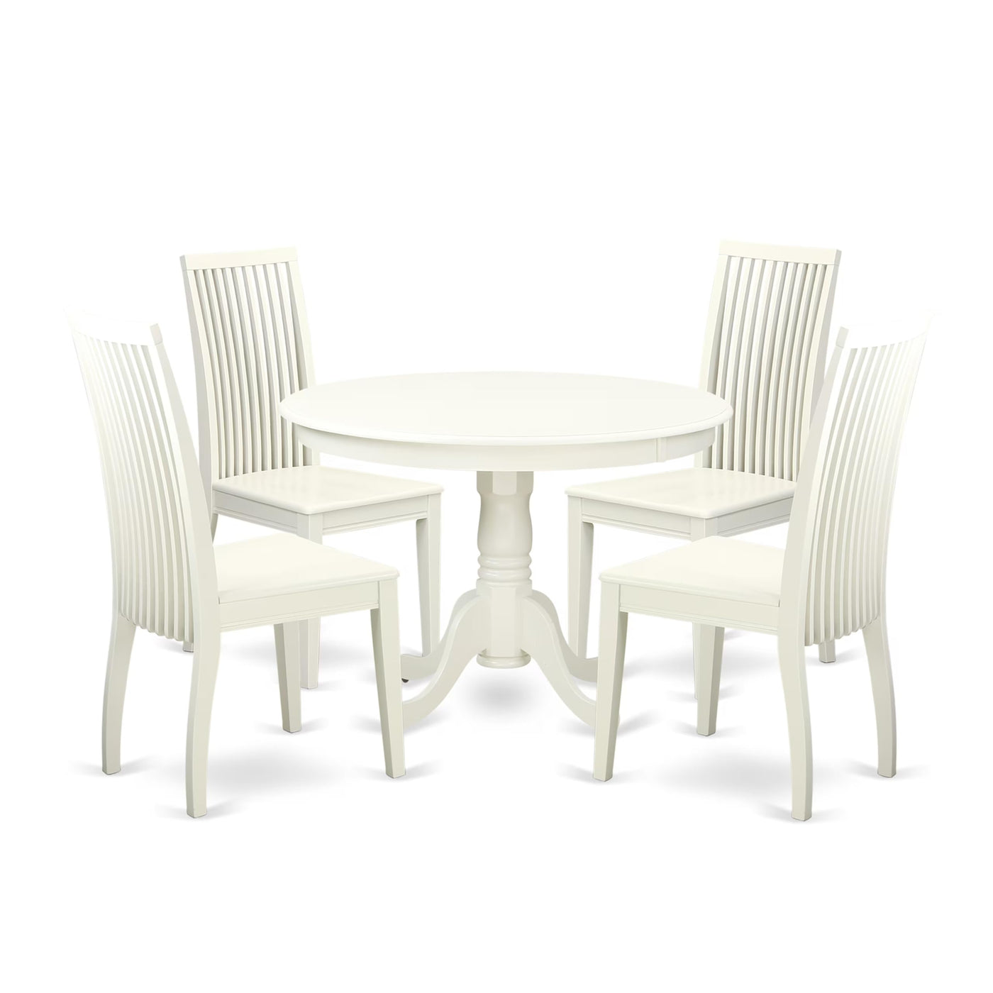 EAST WEST FURNITURE - HLIP5-LWH-W - 5-PC DINING ROOM TABLE SETThe 5-piece dining set comprises 4 sturdy wooden chairs and a luxurious, modern round dining table that adds elegance to your dining area. The breakfast table has a lovely round shape and is supported by 4 wooden legs. Both the pedestal kitchen table and kitchen dining chairs are coated with a high-quality Linen White color. They are designed for easy maintenance and everyday use, boasting a Linen White finish. This set is perfect for all occasions, from everyday meals to celebrations. The wood dining chairs feature stylish high slatted backs, solid wood seats, and beautiful wooden legs. Crafted from premium Asian Hardwood, the round table and wooden chairs are durable and long-lasting, offering a classic appearance. This well-designed dining table set is particularly popular in modern homes. You will be delighted to bring this beautiful set into your home, as it can be used in both dining rooms and kitchens. The versatile round breakfast table is ideal for dining purposes. After dinner, you can conveniently tuck the mid-century dining chairs under the table to create more space in the dining room. These comfortable solid wood chairs provide an elegant dining environment for enjoying meals with family, friends, and guests during gatherings or parties.PRODUCT FEATURES: Frame Material: Asian Wood Dining chairs Color: Linen White Dining table Color: Linen White Wood dining room chairs Size: Length: 21; Width: 18; Height: 39. Wood dining table Sizes: Length: 42; Width: 42; Height: 29.5.Included: A Modern Kitchen Table and 4 Kitchen Dining Chairs.
