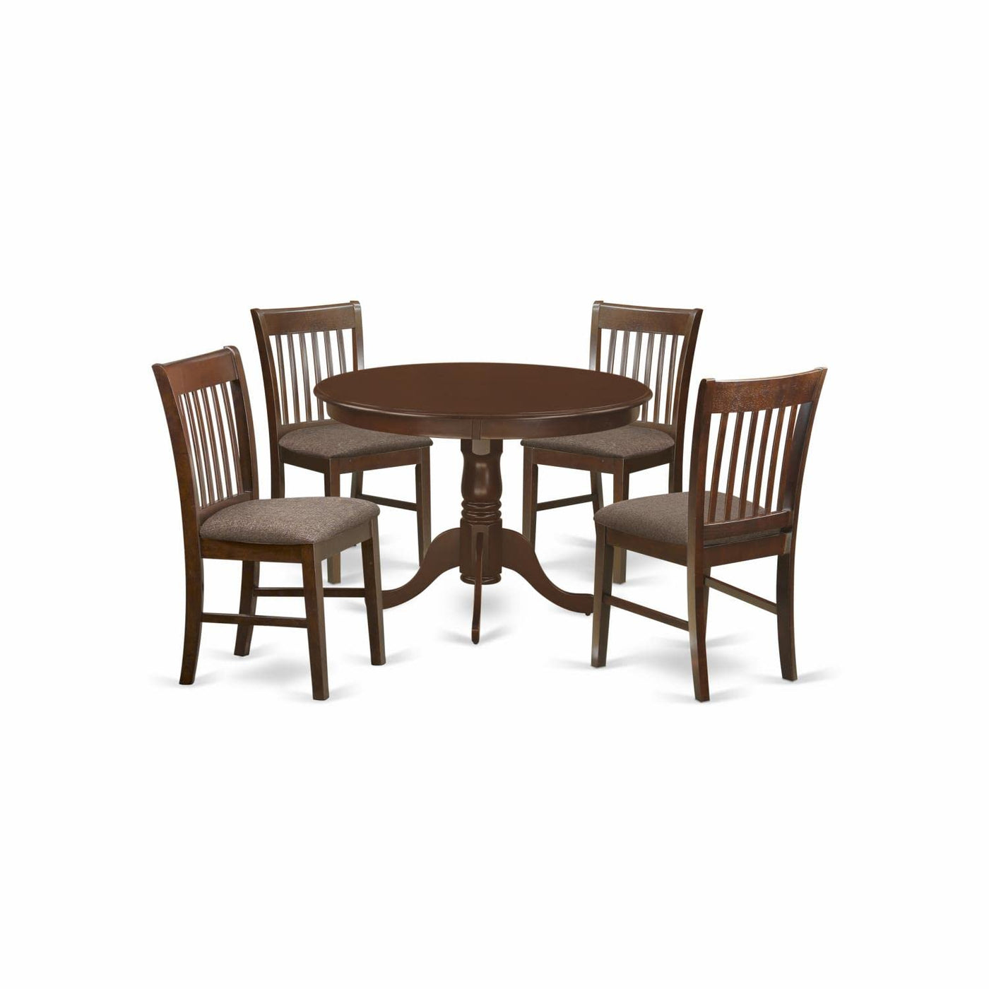 EAST WEST FURNITURE - HLNO5-MAH-C - KITCHEN TABLE SETThis 5-piece kitchen table set consists of 4 dining room chairs and a dinner table. The dining chairs have a Slatted Back design and are equipped with Linen Fabric seats, while the modern table features a Round top and a pedestal leg. It adds a touch of elegance to your dining room. The Mahogany table top and Mahogany Finish Base ensure a flawless and timeless appearance for this exquisite dining table. Additionally, the contemporary dining room chairs have Mahogany finished wooden legs and comfortable Linen Fabric seats, bringing a touch of modern sophistication to any dining room. Our team of highly skilled carpenters has meticulously crafted these dining room chairs and the modern dining table, ensuring a sleek and premium finish for this kitchen table set. This exceptional-quality kitchen set is ideal for any dining area and can be used for casual home parties or intimate gatherings. We prioritize both innovation and convenience in our products, providing easy-to-follow assembly instructions for the dinner table and dining chairs.PRODUCT FEATURES: Frame Material: Asian Wood Frame Color: Mahogany Table Top Style: Round Chair Back Style: Slatted Seat Material: Linen Fabric Chair Dimensions: Length: 19; Width: 18; Height: 35. Table Dimensions: Length: 42; Width: 42; Height: 29.5.Included in the Package: 4 Modern Dining Chairs and a Dinner Table.
