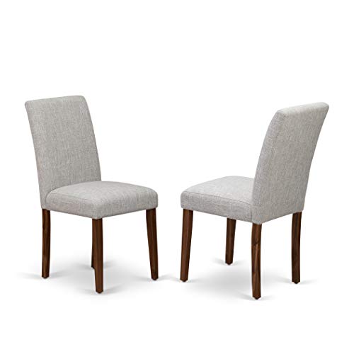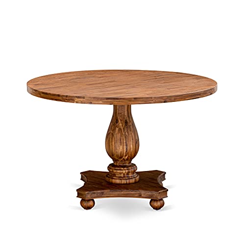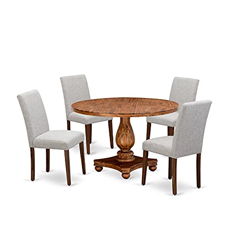 EAST WEST FURNITURE - I2AB5-N35 - 5-PIECE ROUND DINING TABLE SETThis 5-Piece dining ensemble includes a modern kitchen table and 4 wooden chairs, designed to comfortably accommodate your family in any dining room. Constructed from robust Asian wood, this dining set assures durability and longevity. The quartet of mid-century dining chairs comes with foam-padded seats wrapped in Doeskin linen fabric, ensuring you stay comfortable even during long sitting sessions. Upholstered in high-quality linen fabric, the backrest cushions on the chairs add another layer of comfort. The appeal of any dining area is significantly enhanced by this attractive set, which features a solid wood frame. Infuse your home decor with a touch of modernity using our round kitchen dining table set. The Antique Walnut finish lends a unique charm to any kitchen, while the wooden legs of the dining chairs and table contribute to the set's sturdy and classic ambiance. With a classy design in a premium finish, it is the perfect match for any dining room. Transform your interior decor with our antique-styled dining set. This contemporary dining ensemble adds a layer of splendor to your kitchen that you and your family will certainly appreciate. The smooth surface of the dining set makes it easy to clean with just a damp cloth, ensuring hassle-free maintenance.PRODUCT FEATURES Wood Material: Rubberwood Fabric Type: Linen Fabric Linen Fabric Color: Doeskin Mid Century Modern Dining Chairs Legs Color: Antique Walnut Wood Dining Chair Back Style: High Back Modern Kitchen Table Color: Antique Walnut Dimension of Mid Century Round Dining Table: Length: 48; Width: 48; Height: 30. Padded Chair Dimension: Length: 22; Width: 17.20; Height: 35.20.Included: 1 Wood Round Dining Table and 4 Modern Chairs.