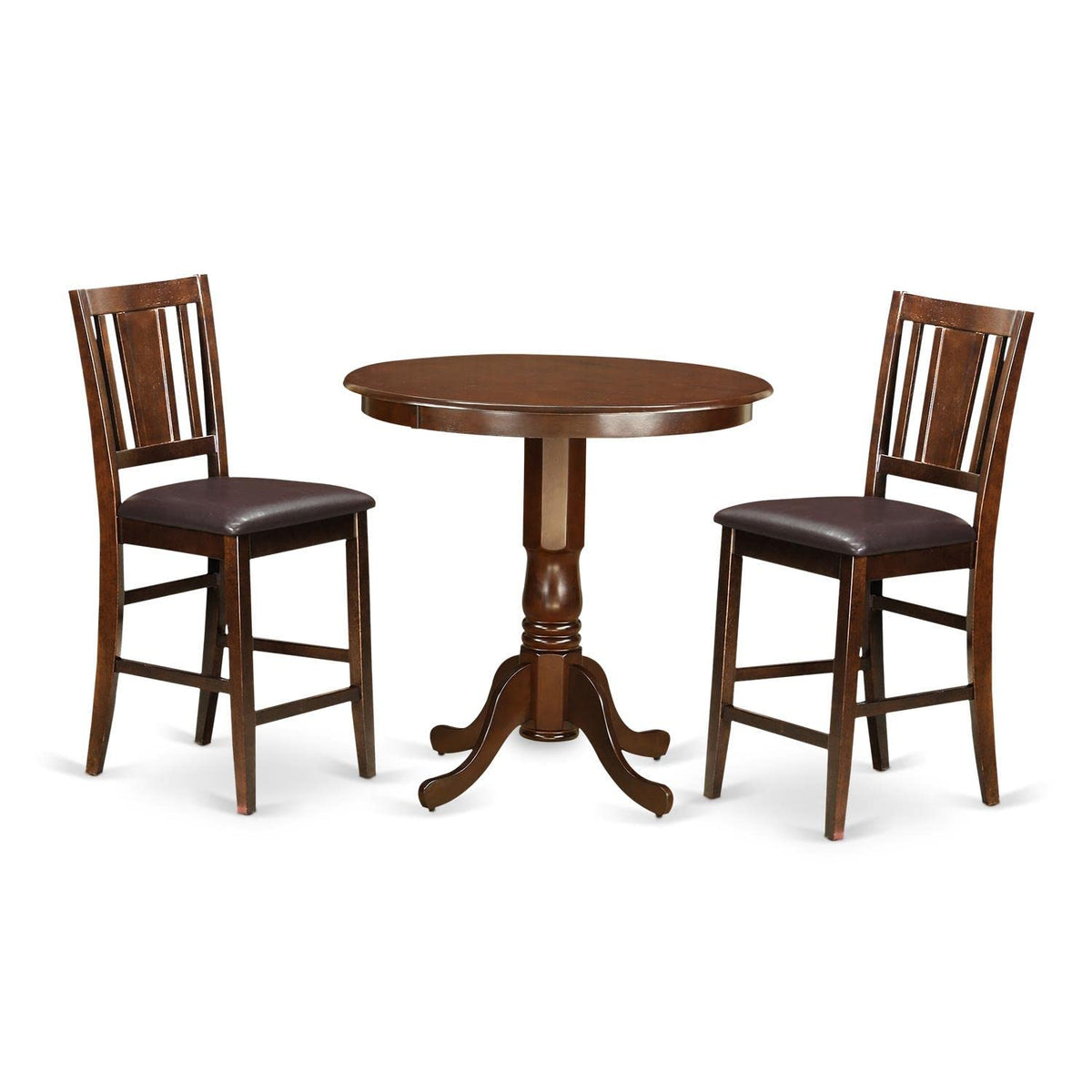EAST WEST FURNITURE - JABU3-MAH-LC - kitchen SETOur 3-piece dining ensemble includes a round wooden table and 2 contemporary chairs, offering a stylish addition to your dining space. The chairs feature faux leather seats and panel backs for comfort and style, and the table stands on a single pedestal leg. Both the table and the sturdy legs of the chairs boast a mahogany finish, bringing a warm, luxurious tone to your dining area. Our dining set is enhanced with a high-quality finish that offers an appealing look suitable for any dining room. Highly skilled carpenters have meticulously crafted the chairs and table, ensuring a smooth and sophisticated finish to this kitchen set. This top-tier dining ensemble is a perfect fit for any dining space and is versatile enough for both casual home parties and intimate gatherings. We pride ourselves on offering innovative designs that are easy to assemble. The set comes with clear instructions for assembling the dining table and chairs, and should you need any assistance, we are always available to help. Purchase our products with complete confidence, as our topmost priority is to ensure the happiness of our customers.PRODUCT FEATURES: Frame Material: Asian Wood Frame Color: Mahogany Table Top Style: Round Chair Back Style: Panel Seat Material: Faux Leather Chair Dimensions: Length: 21; Width: 17; Height: 42. Table Dimensions: Length: 36; Width: 36; Height: 36.Included in the Package: 2 Kitchen Chairs and a Wooden Dining Table.