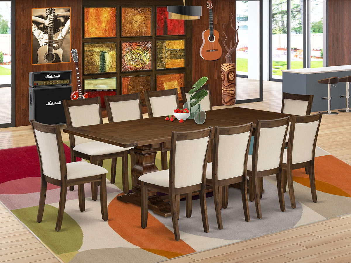 EAST WEST FURNITURE - LAMZ11-N8-32 11-Pc MODERN DINING SETIntroducing our highly sought-after 11-Piece kitchen table set, designed to elevate the visual appeal of any dining room. Included in our kitchen set is an exquisite rectangular modern table accompanied by 10 captivating dining chairs. Indulge in delightful meals with your family on this elegant and contemporary table. With its timeless style, our kitchen dining table set effortlessly enhances the beauty of any dining room. The wooden dining chairs, upholstered in high-quality Linen Fabric, provide optimal comfort and an exceptional seating experience. The dining table features a rectangular tabletop and sturdy wood double pedestal. Our dining chairs feature Light Beige Fabric seats and chair legs made of Sand Blasting Antique Walnut Solid wood, exuding a warm and inviting ambiance. This wonderful combination of mid-century dining chairs creates a charming and cozy atmosphere. The set adds a stylish touch to your home and seamlessly integrates with any home decor. Crafted from superior Rubber Wood, our progressive dining table set ensures lasting quality. Both the kitchen chairs and the dining room table are easy to assemble. Rest assured, our dining table set is assembled following the guidelines provided within the package. Furthermore, the dining set is effortless to clean, maintaining a fresh look in any kitchen setting.PRODUCT FEATURES: Frame Material: Asian Wood Table Color: Antique Walnut Chair Legs Color: Sand Blasting Antique Walnut Seat Material: Linen Fabric Fabric Color: Light Beige Chair Back Style: Stylish High Back Dimension of Table: Length: 92/68; Width: 42; Height: 30. Chair Dimension: Length: 19.5; Width: 17.7; Height: 36.8.Includes Package: A Dining Room Table and 10 Excellent Room Chairs.