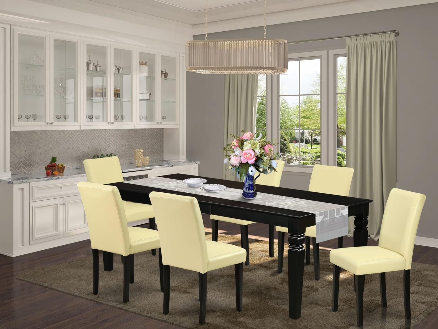 East West Furniture - Lgab7-Blk-73 - Dining Room Setintroduce Sophistication And Charm To Your Dining Room With Our Highly Coveted 7-Piece Dining Set. This Set Effortlessly Enhances The Visual Appeal Of Any Dining Area, Featuring A Splendid Rectangular Dining Table And 6 Stunning Chairs. Featuring A Sleek And Modern Design, This Dining Table Presents A Wire Brushed Black Tabletop And Legs, Perfectly Coordinated With The Matching Finish. Accompanying The Table Are Our Parson Dining Chairs, Which Provide Both Comfort And Style With Their Eggnog Pu Leather Seats And Four Legs Also Finished In Wire Brushed Black. Together, This Dining Set Achieves Impeccable Color Coordination, Emanating An Atmosphere Of Elegance And Sophistication That Effortlessly Complements Any Home Decor. The Elegant Black Color Exudes A Relaxing And Friendly Ambiance, Infusing Your Dining Area With A Sense Of Tranquility. Meticulously Designed For Comfort, This Well-Crafted Kitchen Table Ensures Extended Hours Of Use Without Compromising On Quality. Complementing The Table'S Appeal Is The Simple Yet Captivating Parson Chair, Which Adds An Element Of Charm And Sophistication To Your Dining Room. Incorporating A Contemporary Twist Into Its Classic Design, This Eye-Catching Chair Breathes New Life Into Any Setting. The Straight Legs Add A Touch Of Rustic Elegance, While The Arched Silhouette And Nail Head Trim Exudes Timeless Sophistication. This Budget-Friendly, Durable, And Comfortable Dining Set Is An Excellent Choice For Those Seeking A Memorable Dining Experience With Their Loved Ones.Product Features: Material: Asian Hardwood Table Color: Black Fabric: Pu Leather Cushion Material: Foam Fabric Color: Eggnog Chair Leg Color: Black Chair Dimensions: Length: 22; Width: 17.20; Height: 35.20. Table Dimensions: Length: 84/66; Width: 42; Height: 30. Weight Capacity: 300 Lbs.Includes: A Rectangular Table And 6 Parson Chairs.Hardware Package And Instruction Manual Are Located In/Under The Seat.
