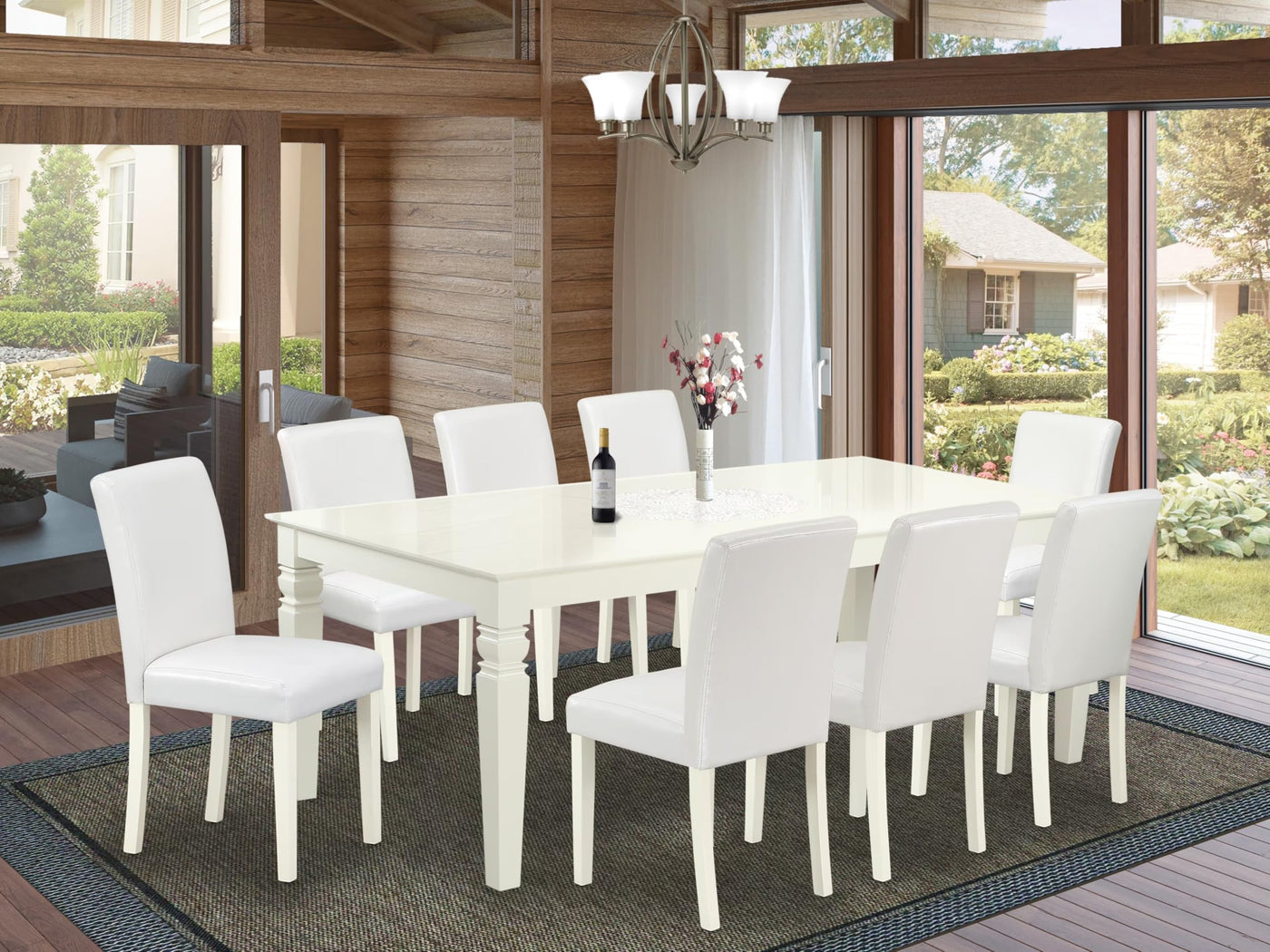 EAST WEST FURNITURE - LGAB9-LWH-64 - DINING ROOM SETElevate your dining room with the utmost sophistication and charm, courtesy of our highly sought-after 9-Piece dining set. This exceptional ensemble effortlessly enhances the aesthetic of any dining area, comprising a splendid rectangular dining table and eight stunning chairs. The dining table boasts a Linen White tabletop and legs with a matching Linen White Finish, exuding an air of elegance. Accompanying the table are chairs featuring a White PU Leather seat and four wooden legs, also finished in Linen White. This dining set masterfully blends top-quality colors to create an elegant and luxurious look that complements any household. With its rectangular shape, the wooden table comfortably accommodates 4-8 individuals, making it perfect for enjoyable shared meals. The wonderful slick Linen White kitchen table seamlessly integrates into various kitchen spaces and corresponds harmoniously to various dining room concepts. Our simple yet charming parson chairs add ambiance and style to your dining room. With a contemporary twist on a classic design, their eye-catching appeal enlivens any space. The frames of the kitchen chairs are engineered with your comfort in mind, offering excellent spinal support and minimizing the chances of back pain. The standard shape, size, and design of this dining set significantly enhance the attractiveness of your dining area. Not only is this dining set budget-friendly, but it also boasts durability and unparalleled comfort, making it an excellent choice for creating memorable dining experiences with your loved ones.PRODUCT FEATURES: Material: Asian Hardwood Table Color: Linen White Fabric: PU Leather Cushion Material: Foam Fabric Color: White Chair Leg Color: Linen White Chair Dimensions: Length: 22; Width: 17.20; Height: 35.20. Table Dimensions: Length: 84/66; Width: 42; Height: 30. Weight Capacity: 300 lbs.Includes: a Rectangular Table and 8 Parson Chairs.Hardware package and instruction manual are located in/under the seat.