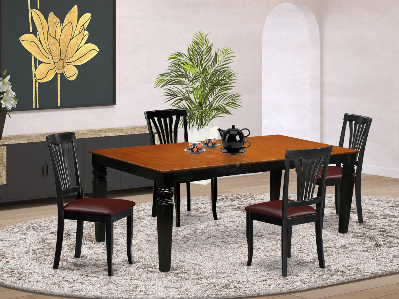 EAST WEST FURNITURE - LGAV5-BCH-LC - DINING ROOM SETThis 5-piece kitchen table set consists of 4 modern dining chairs and a butterfly leaf rectangular table. The dining chairs are made of wood and feature a slatted back, with PU leather seats for added comfort. The rectangular dining table is constructed with a cherry tabletop and a black finish on the base, creating a striking contrast. Our kitchen chairs have been designed with elegance in mind, showcasing faux leather seats and sturdy black solid wood legs. To enhance the overall aesthetic, we have applied a high-quality finish to the dining set, elevating the elegance of any dining area. Our team of highly experienced carpenters has carefully crafted these kitchen chairs and the dining table, ensuring a smooth and high-end finish for this mid-century dining set. This top-quality dinner table set is perfect for both you and any dining area, offering style, and durability. Whether you're hosting casual home parties or intimate gatherings, this kitchen set caters to your needs. We prioritize innovation and ease of assembly, providing clear instructions for you to easily put together the self-storing butterfly leaf kitchen dining table and wooden chairs. In case you encounter any difficulties during assembly, our team is available to assist you. Purchase our products with confidence, as customer satisfaction is our utmost priority.PRODUCT FEATURES: Frame Material: Asian Wood Frame Color: Black and Cherry Seat Material: Faux Leather Chair Dimensions: Length: 22; Width: 18; Height: 36. Table Dimensions: Length: 84/66; Width: 42; Height: 30.Included in the Package: 4 Kitchen Dining Chairs and a Wooden Dining Table.