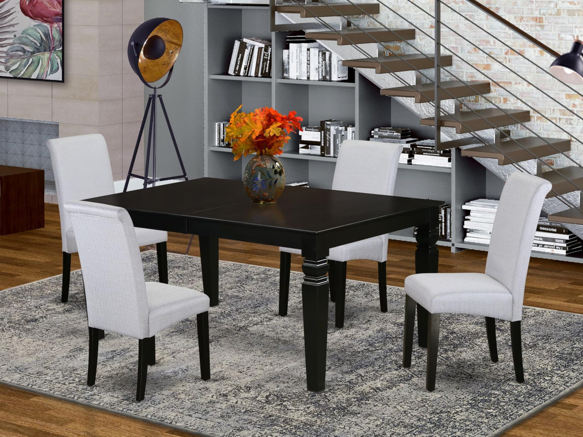 EAST WEST FURNITURE - - LGBA5-BLK-05 - 5-PIECE DINING TABLE SETThis exquisite dining set evokes a timeless missionary style and brings a sophisticated, modern touch to any kitchen or dining room. The set consists of five pieces, including a rectangular kitchen table and 4 parson chairs. The kitchen table creates a warm, familial atmosphere, while its comfortable and luxurious black color adds a relaxing and welcoming feel to any dining area. The tabletop features a gently rounded bevel, making it well-designed and comfortable for extended use. This fantastic black kitchen table is a superb addition to any kitchen space and complements various dining room styles. The barry upholstered dining chair embodies elegance and classic design, offering both comfort and ample seating. Its cushion is made of a durable and easy-to-clean fabric blend (60% cotton, 40% polyester linen) in a neutral color that matches any decor. The parson chair frame showcases a roll-back design and is constructed from sturdy hardwood materials in a black finish, ensuring stability and functionality.PRODUCT FEATURES: Material: Asian Hardwood Color: Black Fabric: Linen Fabric Cushion Material: Foam Fabric Color: Blue-Gray Leg Color: Black Chair Dimensions: Length: 22.5; Width: 18; Height: 38.5. Table Dimensions: Length: 84/66; Width: 42; Height: 30. Weight Capacity: 300 lbs.Includes: a Rectangular Table and 4 Parson Chairs