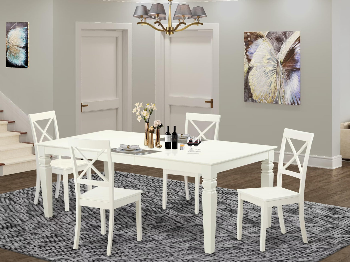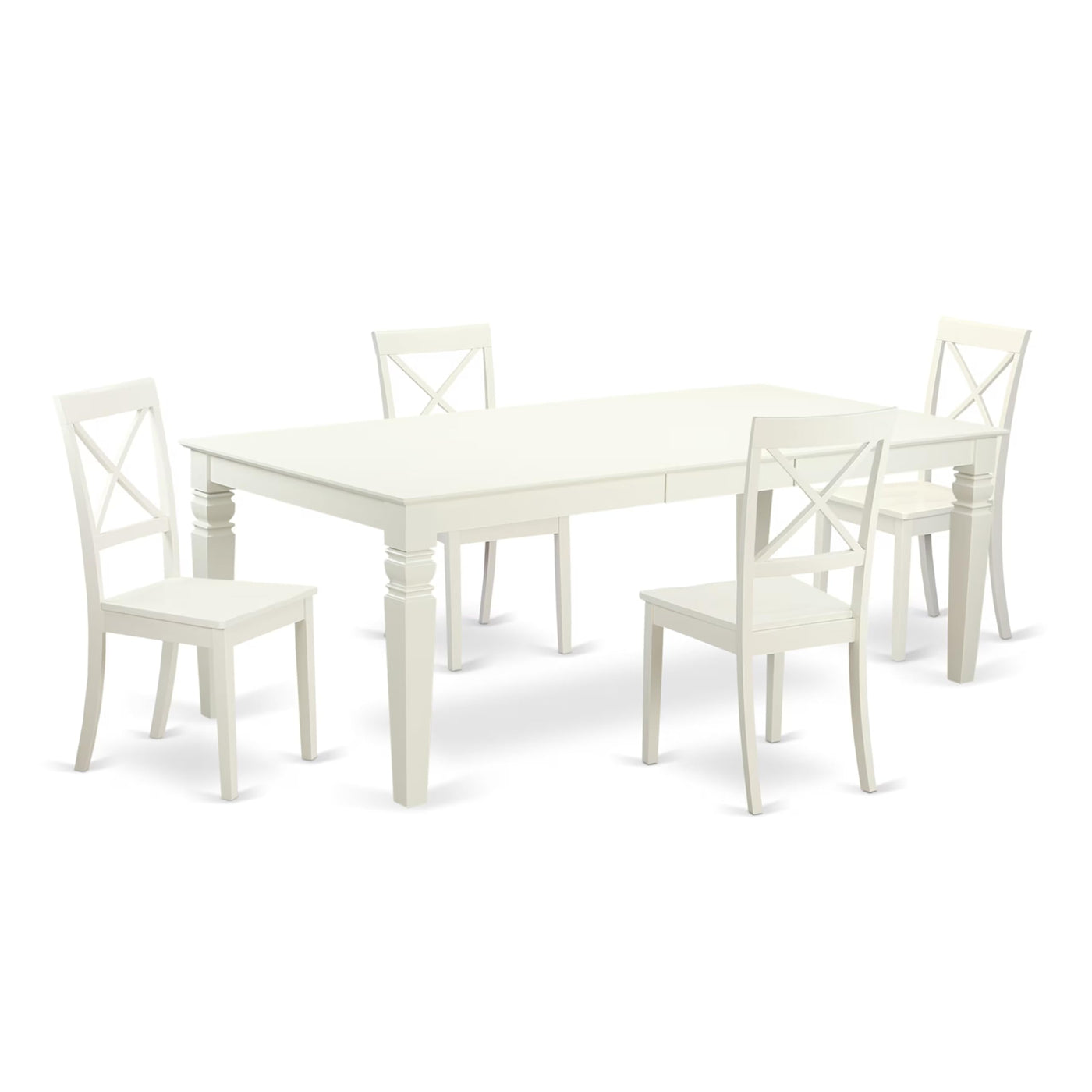 EAST WEST FURNITURE - LGBO5-LWH-W - DINING ROOM SETEnhance your kitchen with this 5-piece dining set, consisting of 4 modern dining chairs and a butterfly leaf rectangular table. The dining chairs are crafted from wood and feature a comfortable Wooden seat and stylish Cross back design. The dining table is characterized by a rectangular top and four sturdy legs. In this contemporary kitchen, the dining table boasts a Linen White (Off White) colored tabletop, perfectly complemented by 4 hardwood legs. Similarly, the dining chairs have 4 legs in Linen White (Off White) and comfortable wooden seats. The impeccable design of our dining chairs and table allows them to seamlessly complement any room decor. This kitchen set has been meticulously created by highly experienced carpenters, ensuring a smooth and high-end finish for this mid-century dining collection. It is a top-quality dining table set, suitable for any dining area. Whether for casual home parties or intimate gatherings, this kitchen set caters to various occasions. We strive to provide both innovation and ease of assembly. Rest assured, you can easily assemble the self-storing butterfly leaf kitchen dining table and wooden chairs by following the provided instructions. If you encounter any difficulties, please feel free to contact us for assistance. Purchase our products with confidence, as customer satisfaction is our top priority!PRODUCT FEATURES: Frame Material: Asian Wood Frame Color: Linen White Seat Material: Wood Chair Back Style: Cross Back Chair Dimensions: Length: 21; Width: 18; Height: 38. Table Dimensions: Length: 84/66; Width: 42; Height: 30.Included in the Package: 4 Kitchen Dining Chairs and a Wooden Dining Table.