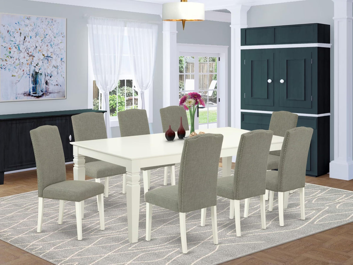 EAST WEST FURNITURE - LGEN9-LWH-06 - DINING ROOM SETIntroducing our exceptional 9-piece kitchen table set that fills us with excitement. It includes a splendid kitchen table featuring a practical butterfly leaf and 8 exquisite dining chairs. This set effortlessly exudes an exceptional allure and sophistication. We are pleased to showcase our modern breakfast table, where the graceful tabletop and legs are beautifully adorned in a calming Linen White finish. The accompanying chairs seamlessly complement this design, boasting seats upholstered in Dark Shitake Linen Fabric and four wooden legs elegantly finished in Linen White. Created entirely from solid wood, from the tabletop to the legs, this ensures durability and high quality. Elevate the style and atmosphere of your dining room with this elegant parson chair, which effortlessly combines contemporary elements with timeless design. Its captivating appeal breathes new life into any space. The traditional parson elements provide a sense of familiarity, while the dark Shiitake-colored linen fabric and clean-lined design add a modern touch. By replacing your old dining set with this one, you can easily rejuvenate your dining area. The straight legs infuse a touch of rustic charm, while the arched silhouette and nail head trim complete the overall look with a dash of classic character.PRODUCT FEATURES: Material: Asian Hardwood Color: Linen White Fabric: Linen Fabric Cushion Material: Foam Fabric Color: Dark Shitake Chair Leg Color: Linen White Chair Dimensions: Length: 24.5; Width: 19; Height: 40.5. Table Dimensions: Length: 84/66; Width: 42; Height: 30. Weight Capacity: 300 lbsIncludes: a Rectangular Table and 8 Parson ChairsHardware package and instruction manual are located in/under the seat.