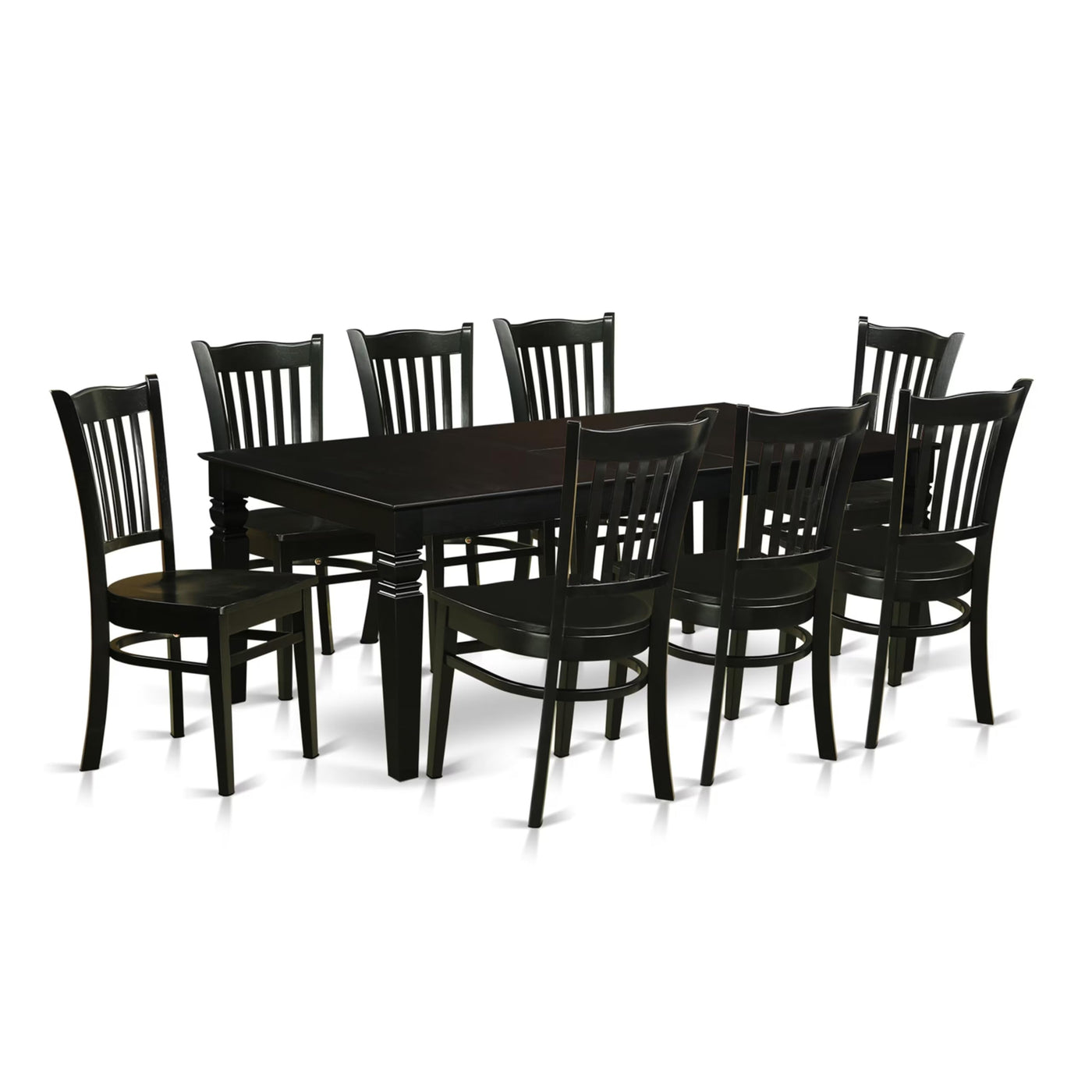 EAST WEST FURNITURE - LGGR9-BLK-W - 9-PIECE DINING ROOM SETTransform your kitchen area into a stunning masterpiece with this exquisite dining room set. This elegant kitchen table Set features a dazzling dinner table and 8 dining room chairs, adding a touch of sophistication to your space. Enhance the mid-century aesthetic of your kitchen with this stylish table set, showcasing sleek black-finished seats and coordinating legs for the dining table. Meticulously crafted by skilled carpenters, this dining room set exudes luxury and boasts a high-quality finish. Made from superior Asian hardwood, commonly known as Rubber Wood, this kitchen set ensures long-lasting durability and stability. Assembly and cleaning are a breeze, saving you valuable time and effort. Effortlessly assemble the dining chairs and table in the comfort of your home, and maintain their cleanliness with ease using any furniture cleanser. Enjoy a fresh and inviting look for your kitchen at all times.PRODUCT FEATURES: Chair Seat: Wood Frame Color: Black Table Legs: 4 Legs Table Top: Rectangular The dimension of the Dining Table: Length: 84/66; Width: 42; Height: 30. Measurements of Kitchen Chairs: Length: 21; Width: 18; Height: 37.Package Include: A Dining Table and 8 Dining Room Chairs
