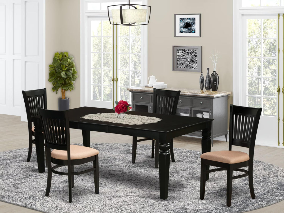 East West Furniture - Lgva5-Blk-C - 5-Pc Small Kitchen Setintroducing Our Modern Dining Table Set, Complete With 4 Beautiful Wooden Chairs And A Stunning 4 Legged Breakfast Table. This Set Includes A Black Solid Wood Mid-Century Dining Table And Black Dining Chairs, Enhancing The Elegance Of Your Living Area. The Rectangular Breakfast Table Is Crafted From High-Quality Rubber Wood. The Dining Chairs Are Made From Top-Quality Wood, Capable Of Enduring Up To 300 Lbs Of Weight. The Kitchen Table Set Features A Superior-Quality Black Finish, Making It Easy To Clean With Any Furniture Clearance. With Its Simple Design, This Small Kitchen Set Assembles Quickly And Can Be Moved Effortlessly. It Is An Essential Piece Of Furniture That Serves As A Dining Space, A Workstation, And A Gathering Place For Family And Friends. Additionally, It Is Suitable For Casual Home Parties. Choose A Kitchen Set That Reflects Your Individuality And Utilizes Your Space Wisely. This Dining Room Table Set Brings A Rustic And Trendy Look To Your Dining Area, Comfortably Seating Four People. Don'T Compromise On Quality Or Style, Even In A Small Space. Enjoy The Excellence Of East-West Furniture!Product Features: Mid-Century Dining Chair Frame Material: Rubber Wood Wood Table Frame Material: Asian Wood Table Top And Legs Color: Black Finish Chair Legs And Back Color: Black Finish Chair Seat Material: Linen Fabric Seat Table Top Style: Rectangular Top Chair Back Style: Slatted Back Dimension Of Kitchen Table: Length: 84/66; Width: 42; Height: 30. Dimension Of Dining Room Chair: Length: 20; Width: 17; Height: 37.Included In Package: 4 Kitchen Chairs And A Dining Table.