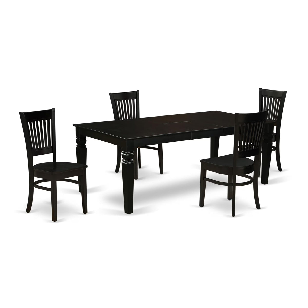 East West Furniture - Lgva5-Blk-W 5-Piece Dining Room Setintroducing Our Kitchen Set, Featuring 4 Attractive Kitchen Dining Chairs And A Remarkable 4 Legged Dining Table. This Modern Kitchen Set Includes A Black Hardwood Kitchen Table And Stylish Black Wooden Dining Chairs, Adding Elegance To Your Living Area. Crafted From High-Quality Rubber Wood, The Rectangular Breakfast Table Ensures Durability. The Kitchen Table Is Constructed From Premium-Quality Wood That Can Withstand Weights Of Up To 300 Lbs. With Its Superior Black Finish, Cleaning This Set Is A Breeze Using Any Furniture Clearance Method. Assembly Of This Small Dining Table Set Is Quick And Easy Due To Its Simple Design. You Can Effortlessly Move It From One Place To Another. The Wood Dining Table Set Is An Essential Furniture Piece, Serving As A Dining Area, A Workspace, And A Gathering Spot For Family And Friends. It Is Also Perfect For Casual Home Parties. Finding A Set That Matches Your Personality And Optimizes Your Space Is Important, Given The Endless Options Available. If You'Re Seeking A Modern Look For Your Kitchen Or Dining Room, This Dining Table Set Is An Ideal Choice. It Brings A Rustic And Classy Touch To Your Dining Area, Comfortably Seating Four People. Don'T Compromise On Quality Or Appearance, Even In A Small Space. Enjoy The Excellence Of East-West Furniture!Product Features: Dining Room Chairs Frame Material: Rubber Wood Small Table Frame Material: Asian Wood Table Top And Legs Color: Black Finish Dining Chair Back And Legs Color: Black Finish Kitchen Dining Chair Seat Material: Wooden Seat Kitchen Dining Chair Seat Color: Black Table Top Style: Rectangular Top Kitchen Chair Back Style: Slatted Back Dimension Of Dining Room Table: Length: 84/66; Width: 42; Height: 30. Dimension Of Kitchen Chair: Length: 20; Width: 17; Height: 37.Consisted Of In Package: 4 Kitchen Dining Chairs And A Mid Century Dining Table.